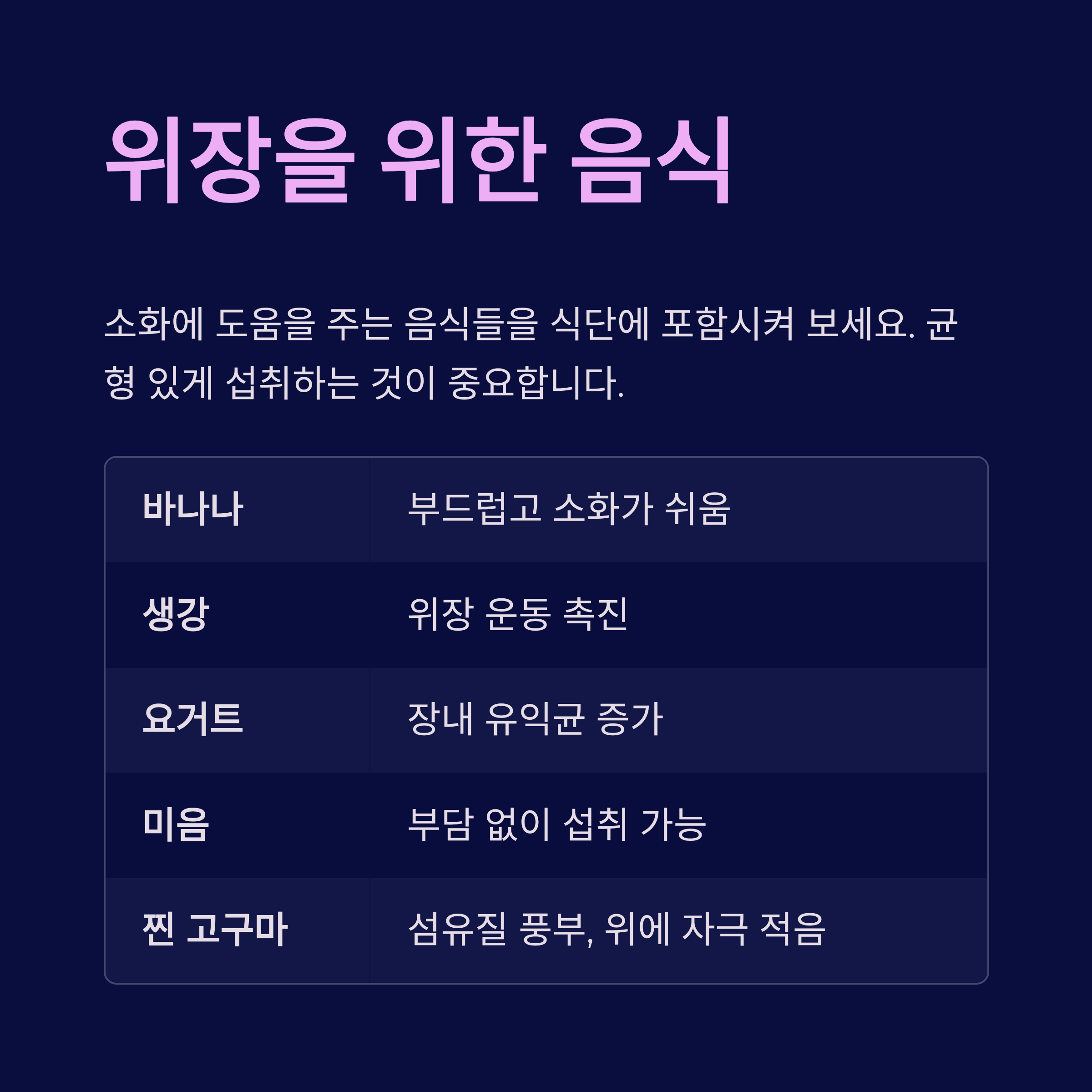 다음은 소화에 도움을 줄 수 있는 음식들을 정리한 표입니다.
