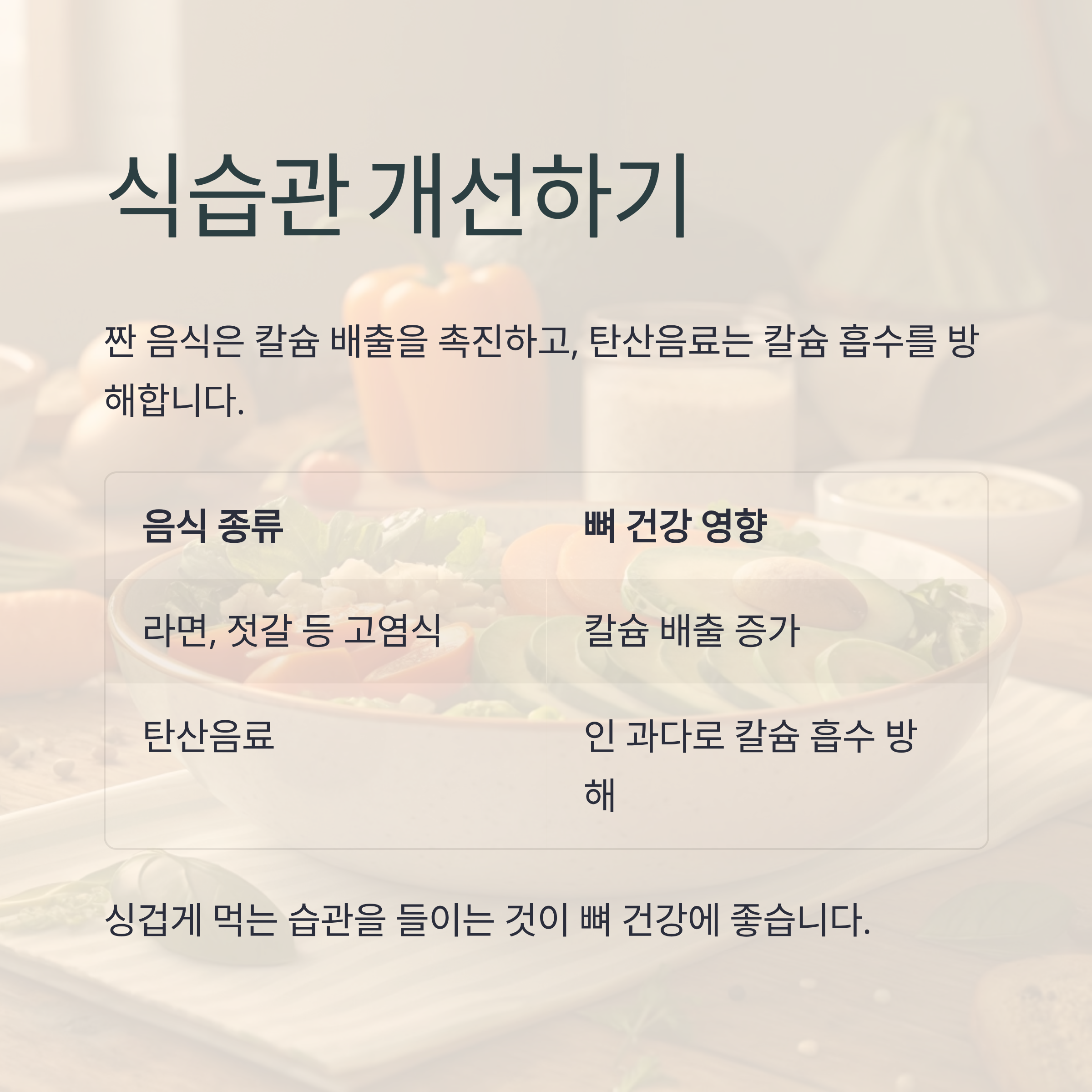 | 라면, 젓갈 등 고염식 | 칼슘 배출 증가 |