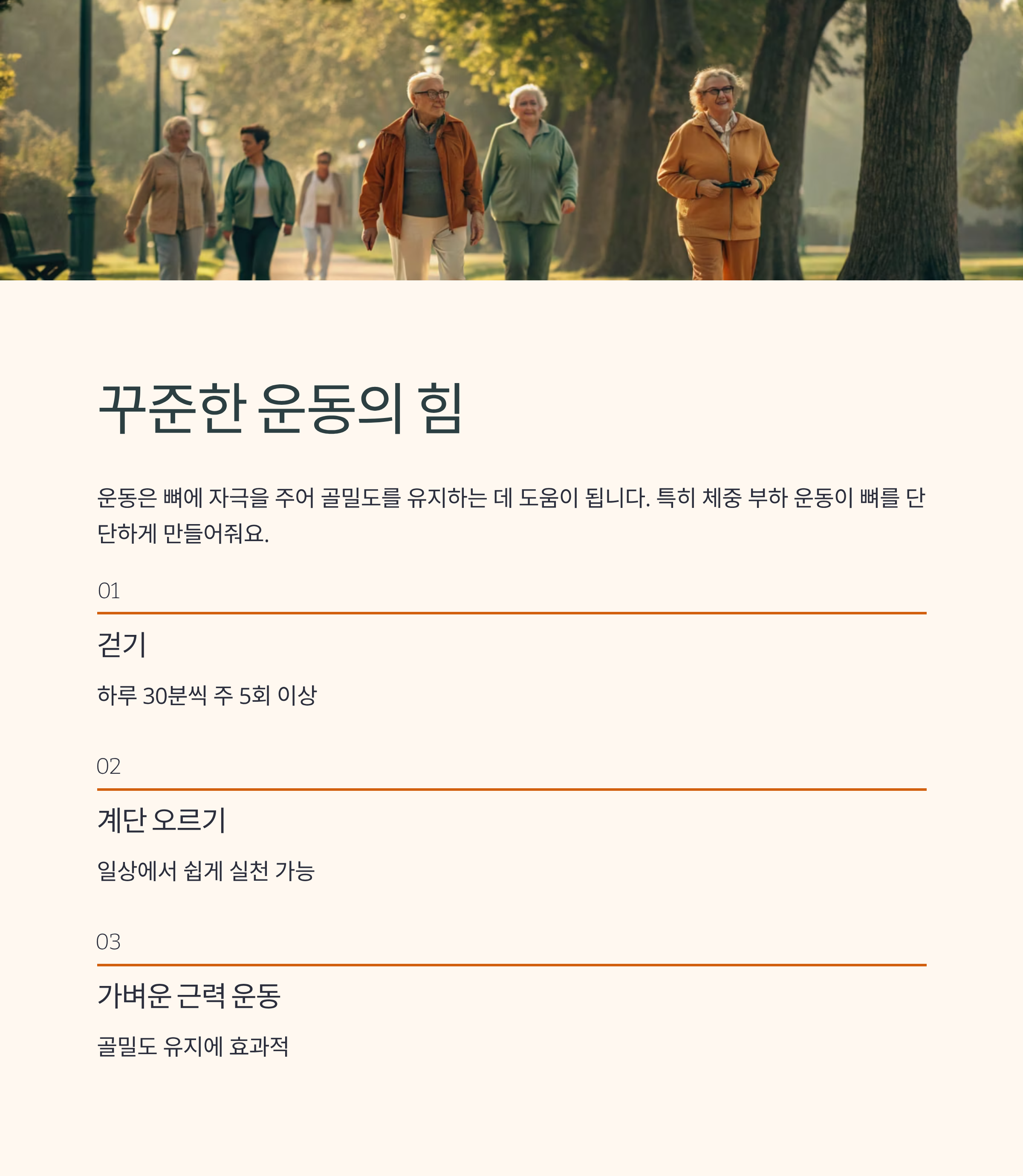 운동은 뼈에 자극을 주어 골밀도를 유지하는 데 도움이 됩니다.