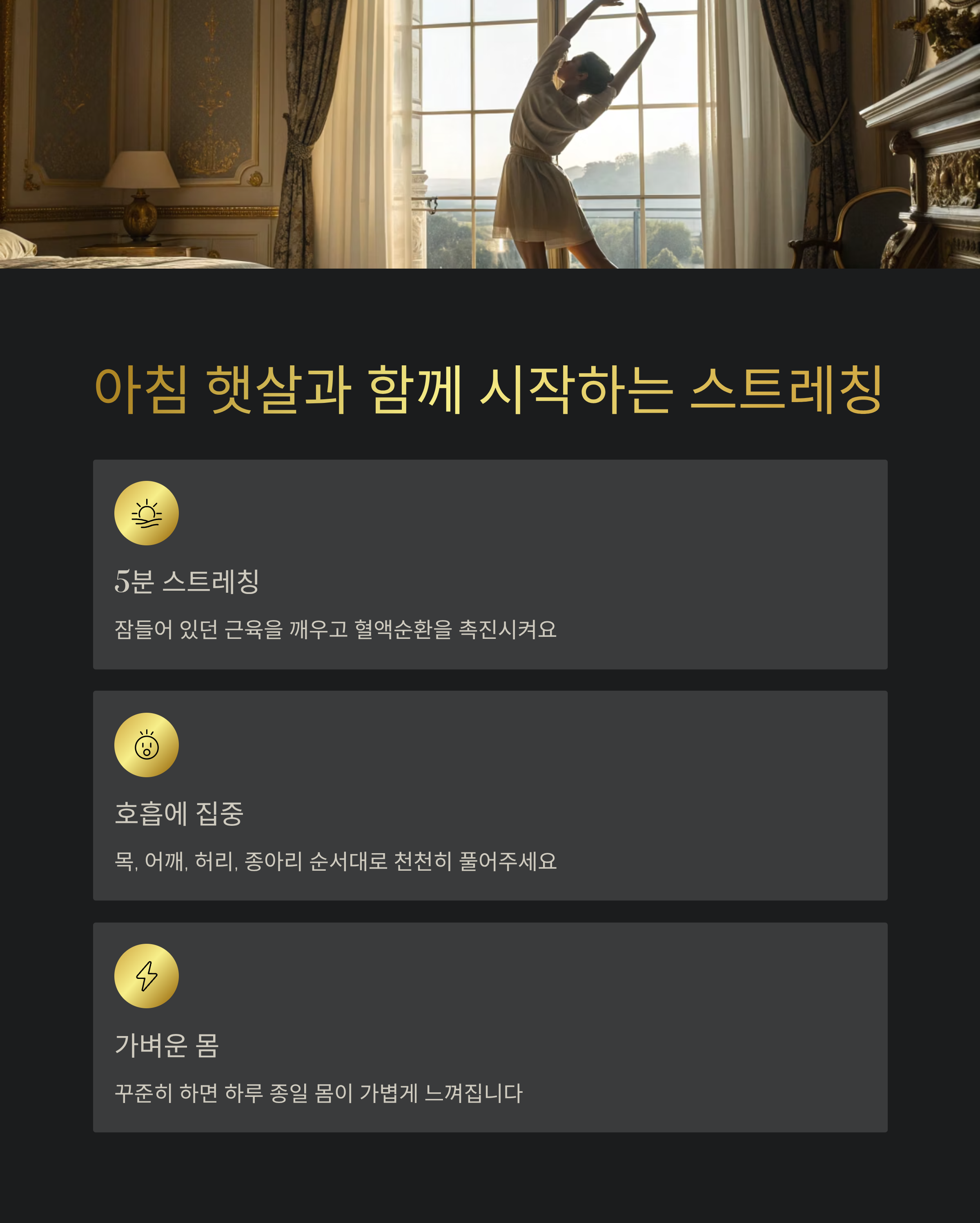 아침 5분 스트레칭은 하루의 에너지를 끌어올리는 첫 걸음입니다.