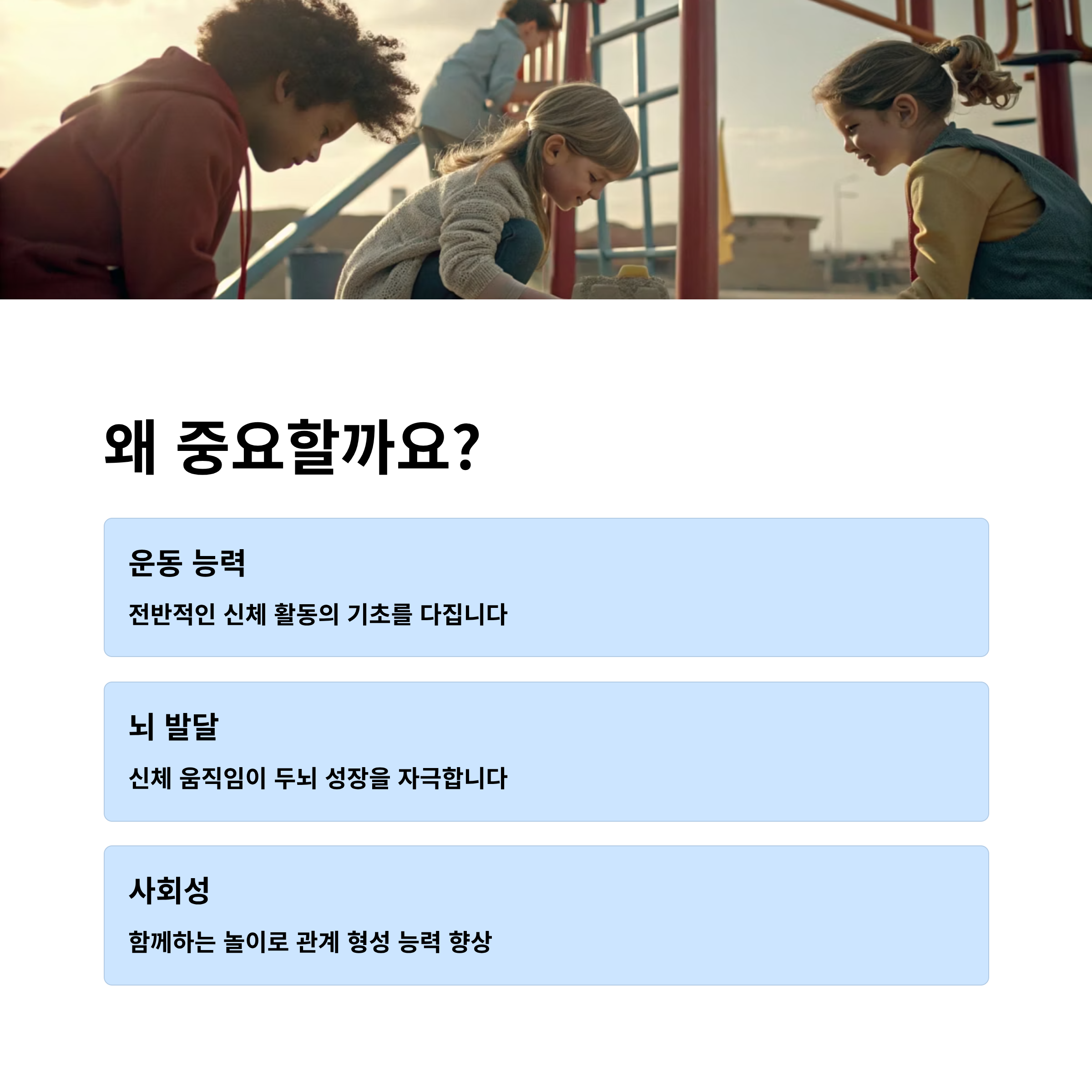 줄넘기, 공 던지기, 미끄럼틀 타기 같은 일상 속 놀이만으로도 충분한 자극이 됩니다.