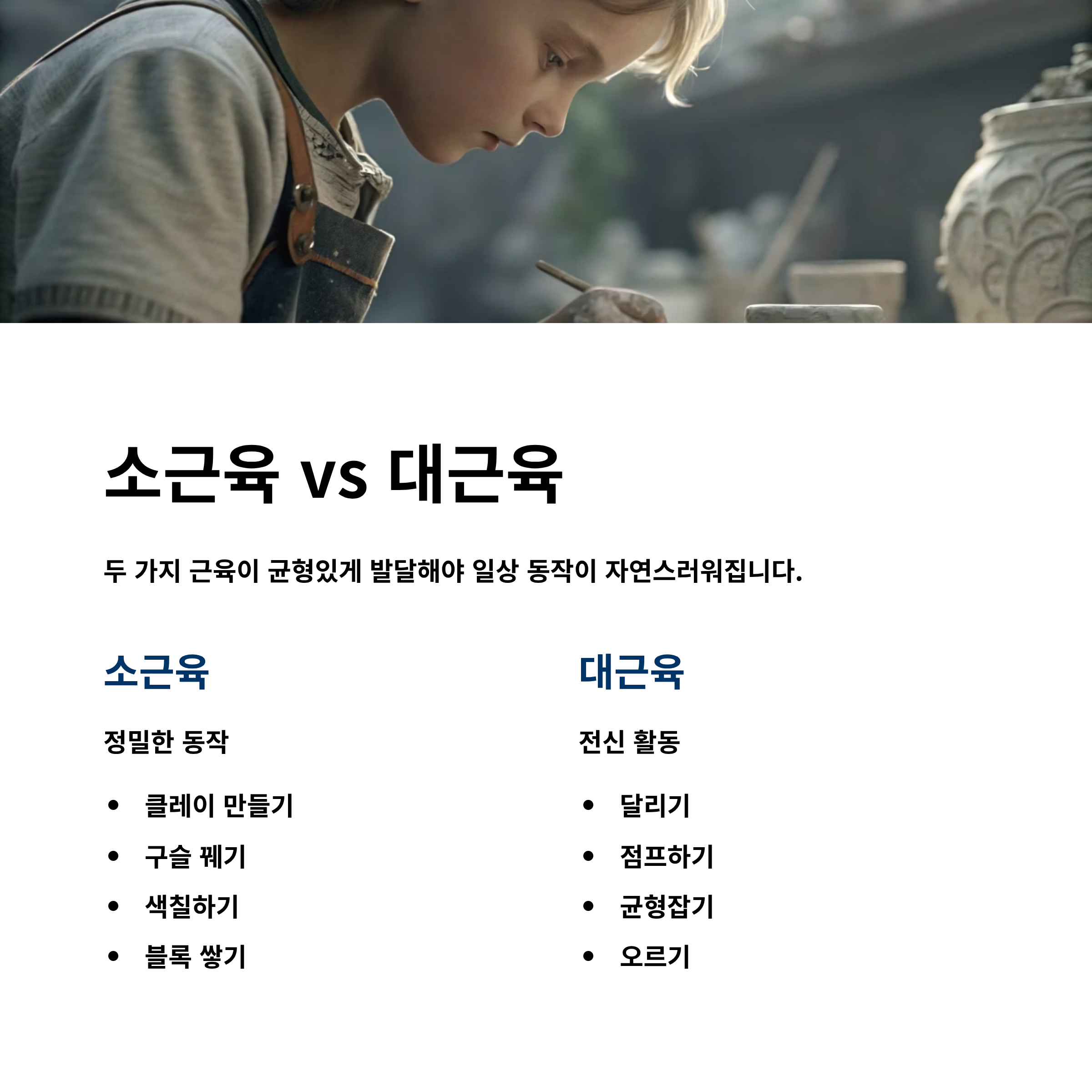 근육은 크게 두 가지로 나뉩니다. 손가락과 손목 같은 작은 움직임에 필요한 소근육, 그리고 팔, 다리, 몸통 전체를 쓰는 대근육.