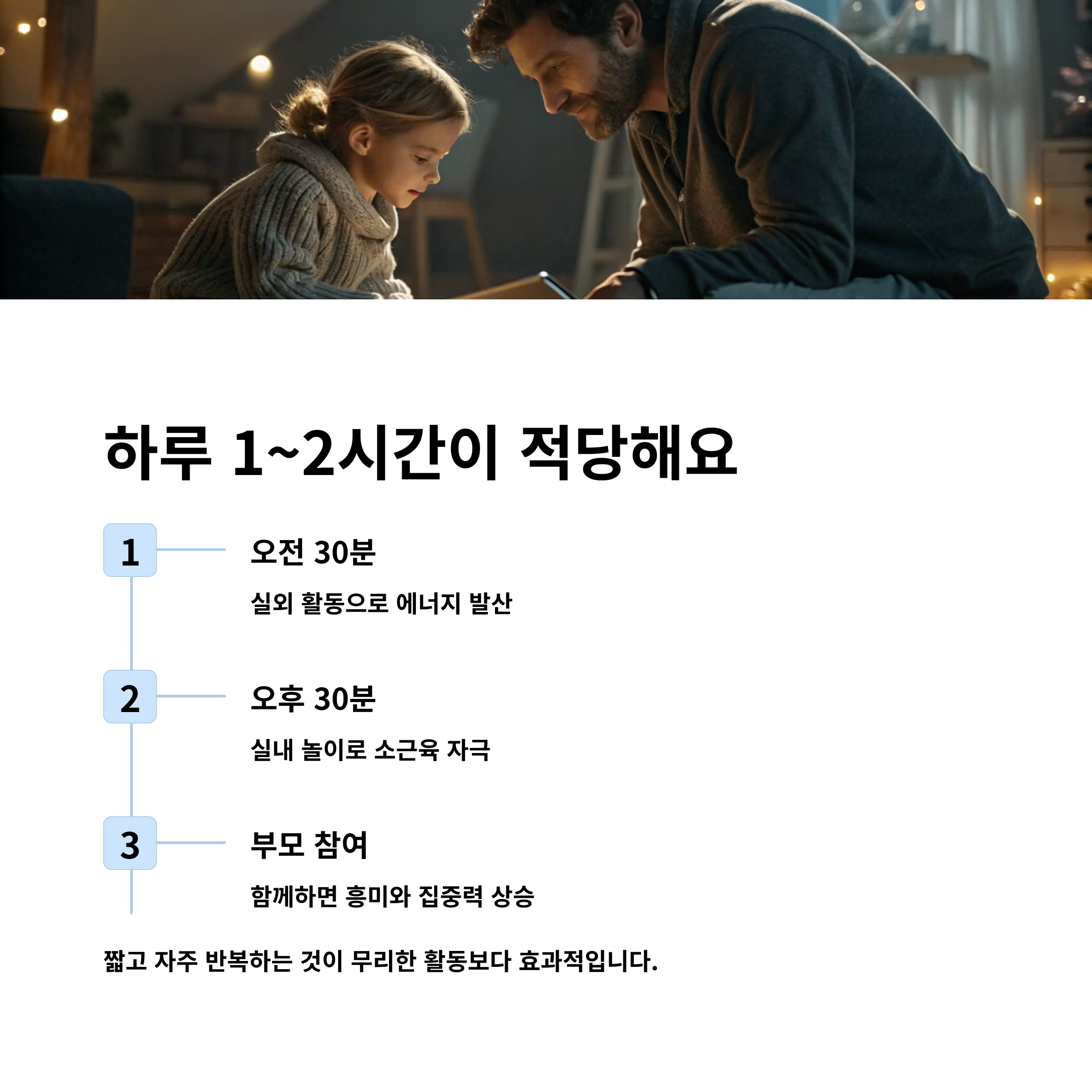 예를 들어, 오전 30분, 오후 30분으로 나누어 실내외 활동을 병행하는 것이 좋습니다. 이때 중요한 건 부모의 참여입니다.