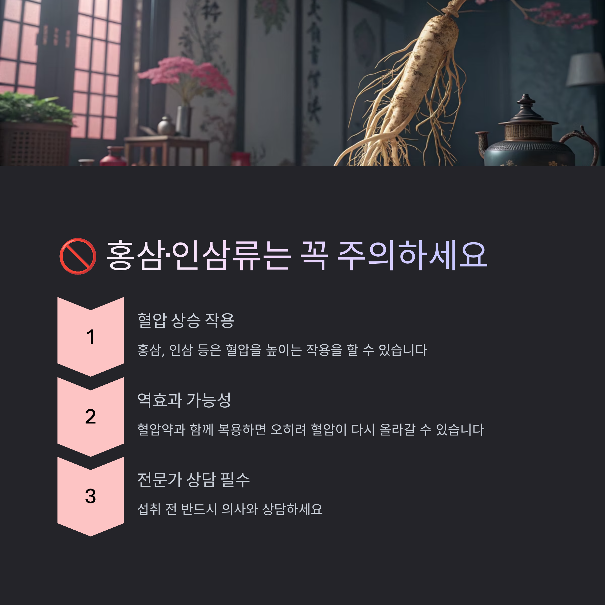 홍삼, 인삼 등은 혈압을 높이는 작용을 할 수 있기 때문에 고혈압 환자에게는 신중한 접근이 필요합니다.