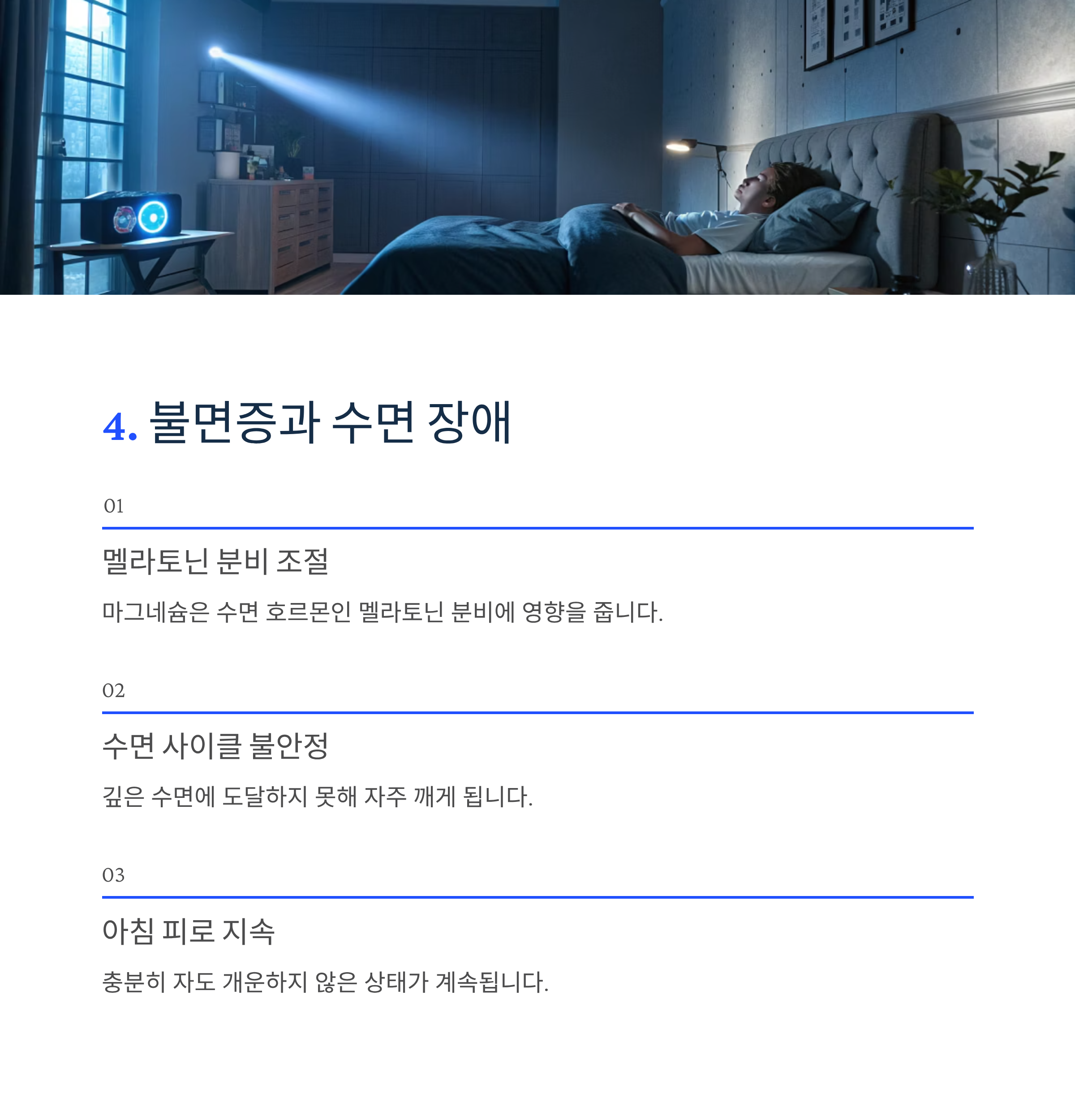 밤에 쉽게 잠들지 못하고 자주 깨는 이유가 단순한 불면증이 아닐 수도 있습니다. 마그네슘은 멜라토닌 분비와 수면 사이클 조절에 영향을 줍니다.