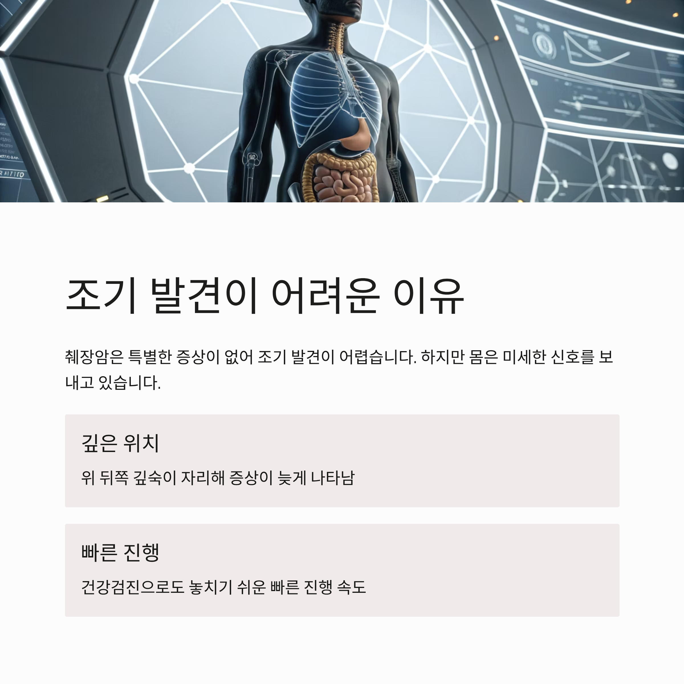 췌장암은 진행이 빨라 건강검진으로도 놓치기 쉽습니다. 따라서 위에 언급한 증상 중 2가지 이상이 동시에 지속된다면 병원을 찾아 정밀검사를 받는 것이 중요합니다.