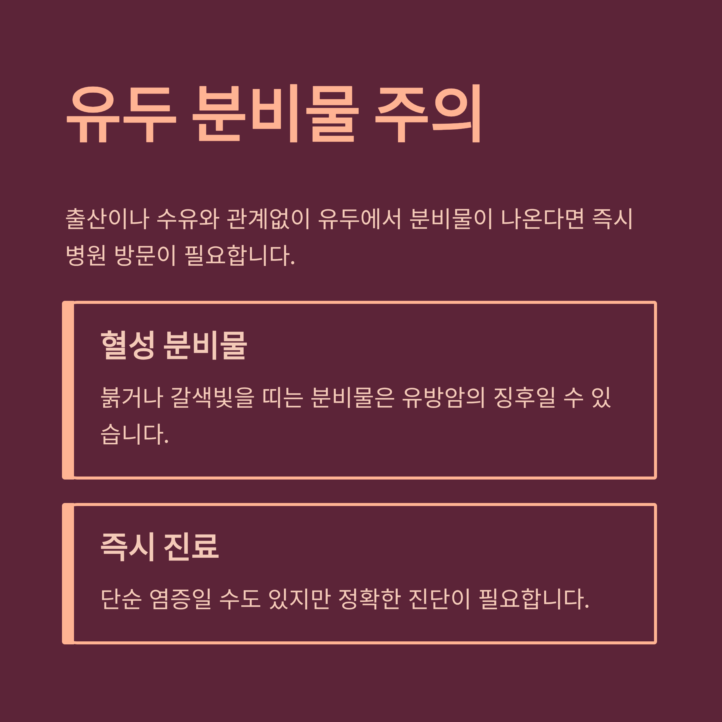출산이나 수유와 관계없이 유두에서 분비물이 나오는 경우, 특히 붉거나 갈색빛을 띠는 혈성 분비물이라면 즉시 병원 진료가 필요합니다. 단순한 염증일 수도 있지만, 유방암의 징후일 가능성도 있습니다.