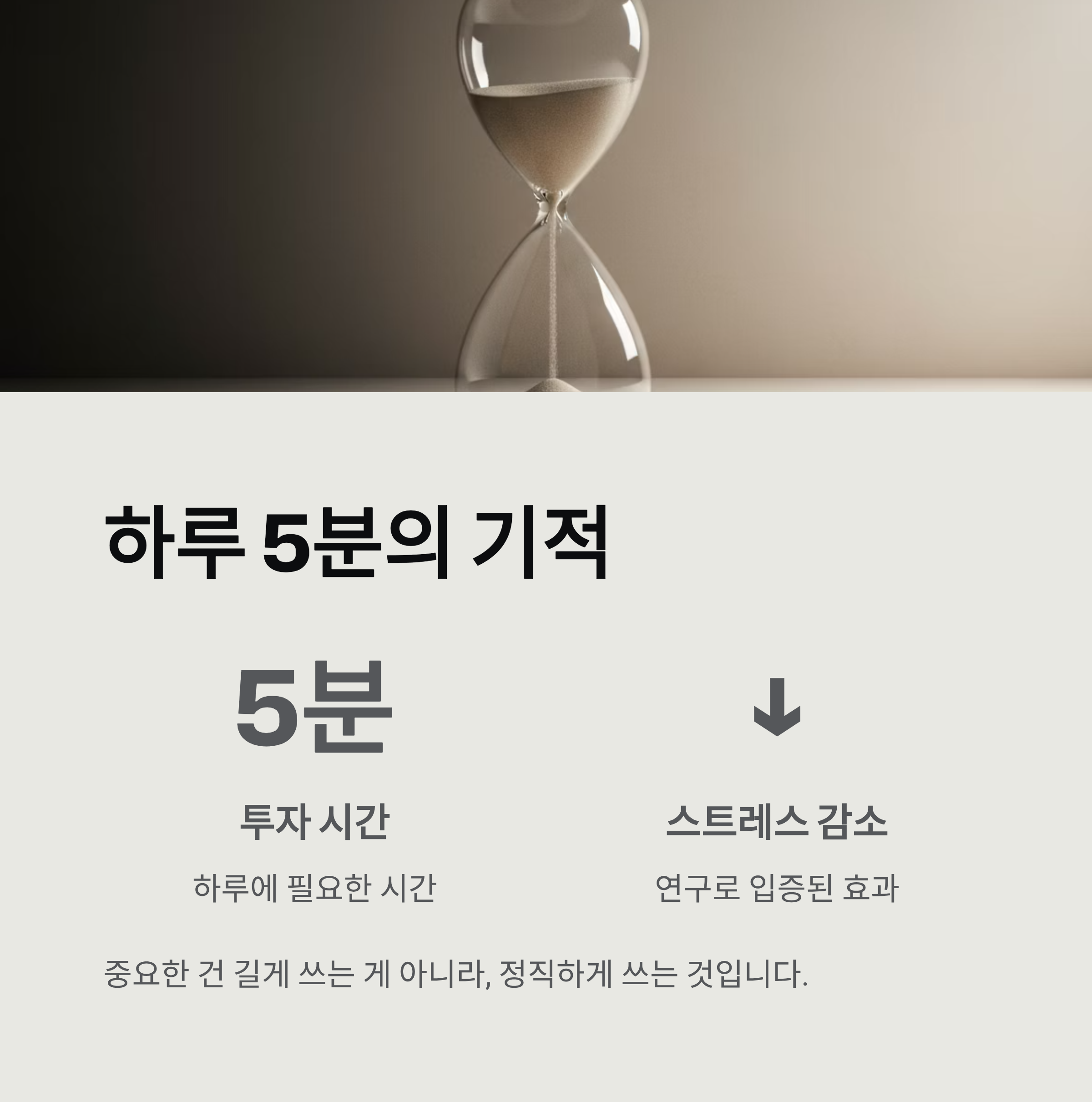 5분만 시간을 내어 감정을 적는 것만으로도 스트레스 수치가 줄어든다는 연구 결과도 있습니다. 중요한 건 길게 쓰는 게 아니라, 정직하게 쓰는 것이에요.