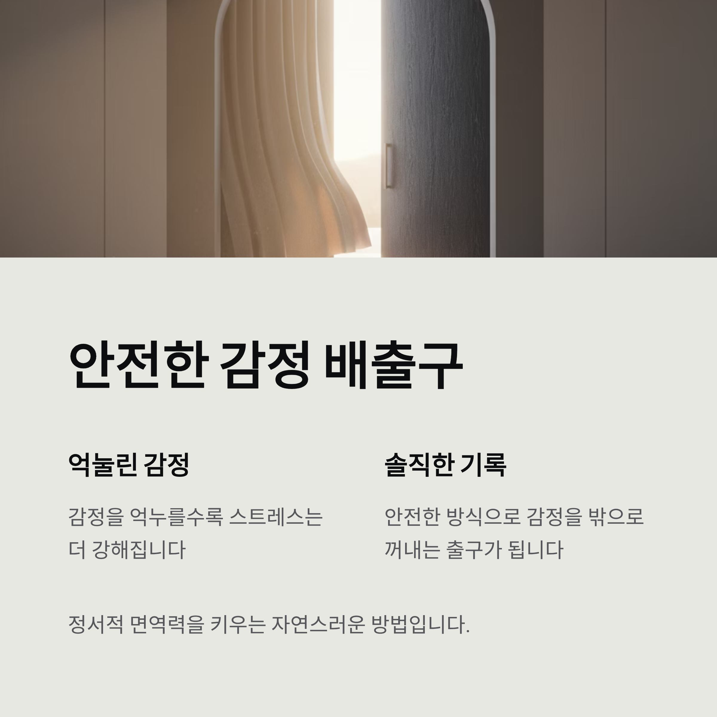 사람은 감정을 억누를수록 스트레스를 더 강하게 느낍니다. 하지만 감정을 솔직하게 적는 행위는 안전한 방식으로 감정을 밖으로 꺼내는 출구가 됩니다. 이는 정서적 면역력을 키우는 데 도움이 되지요.