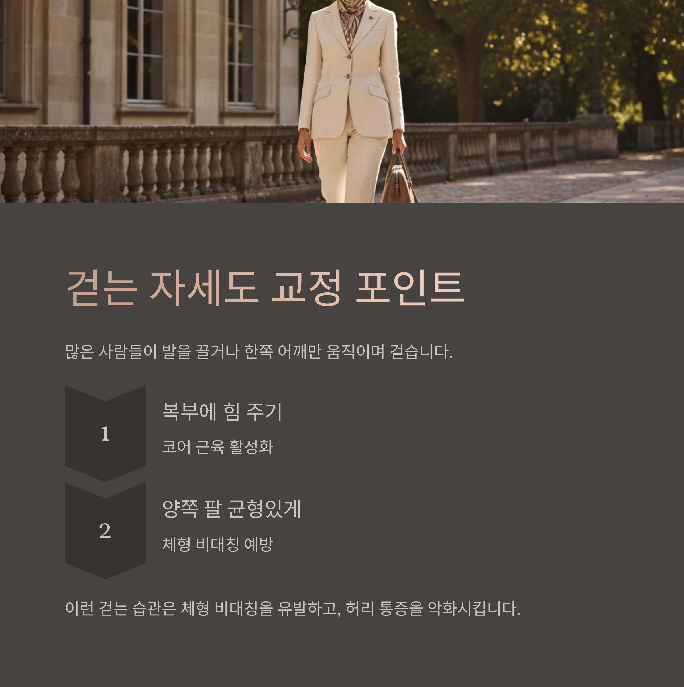 이런 걷는 습관은 체형 비대칭을 유발하고, 허리 통증을 악화시킵니다.