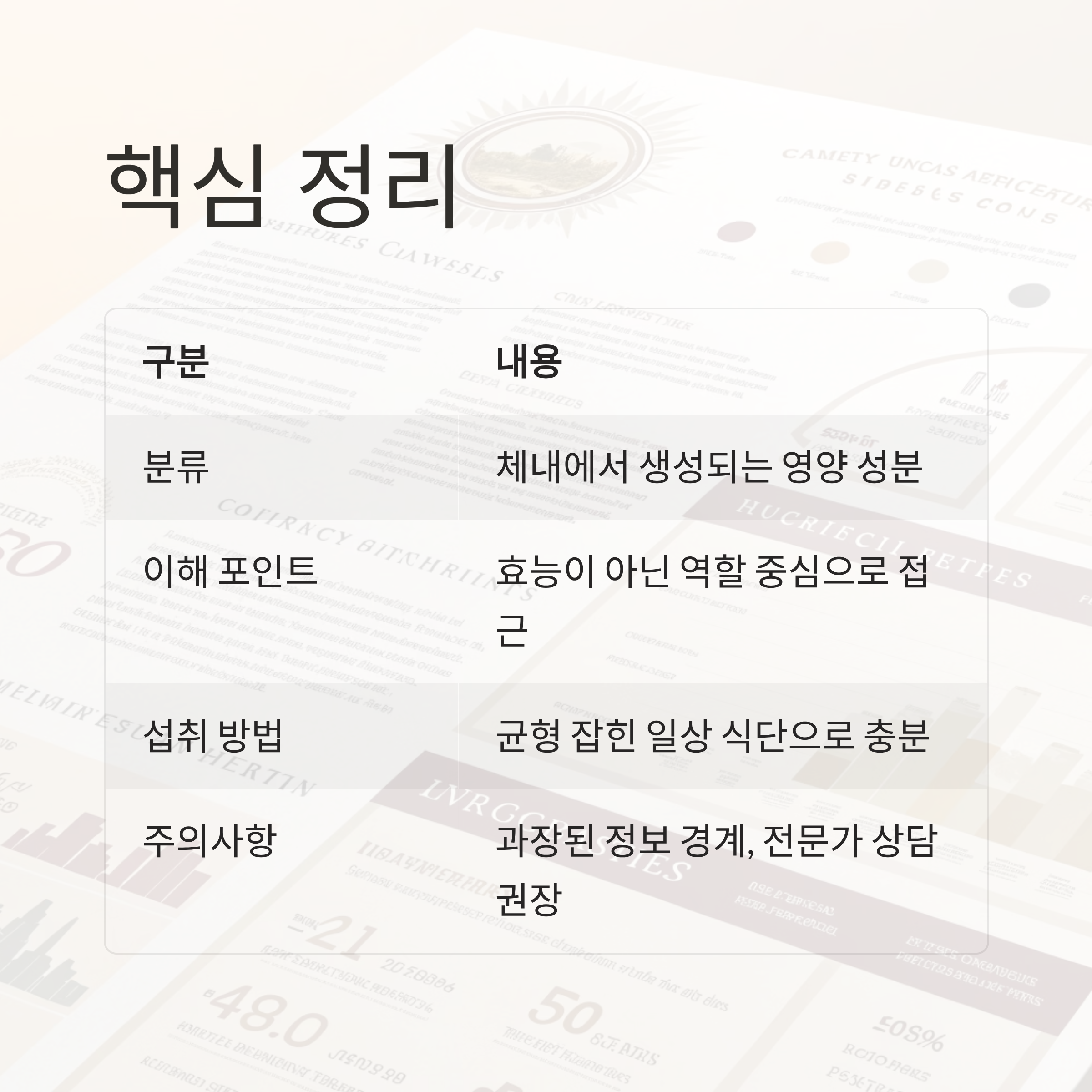 결국 카르니틴은 효능 중심이 아니라 영양학적 역할 중심으로 바라보는 것이 가장 이상적입니다. 특정 기능을 기대하기보다 우리 몸이 가진 자연스러운 대사 과정 속 한 구성 요소 정도로 받아들이면 충분해요.