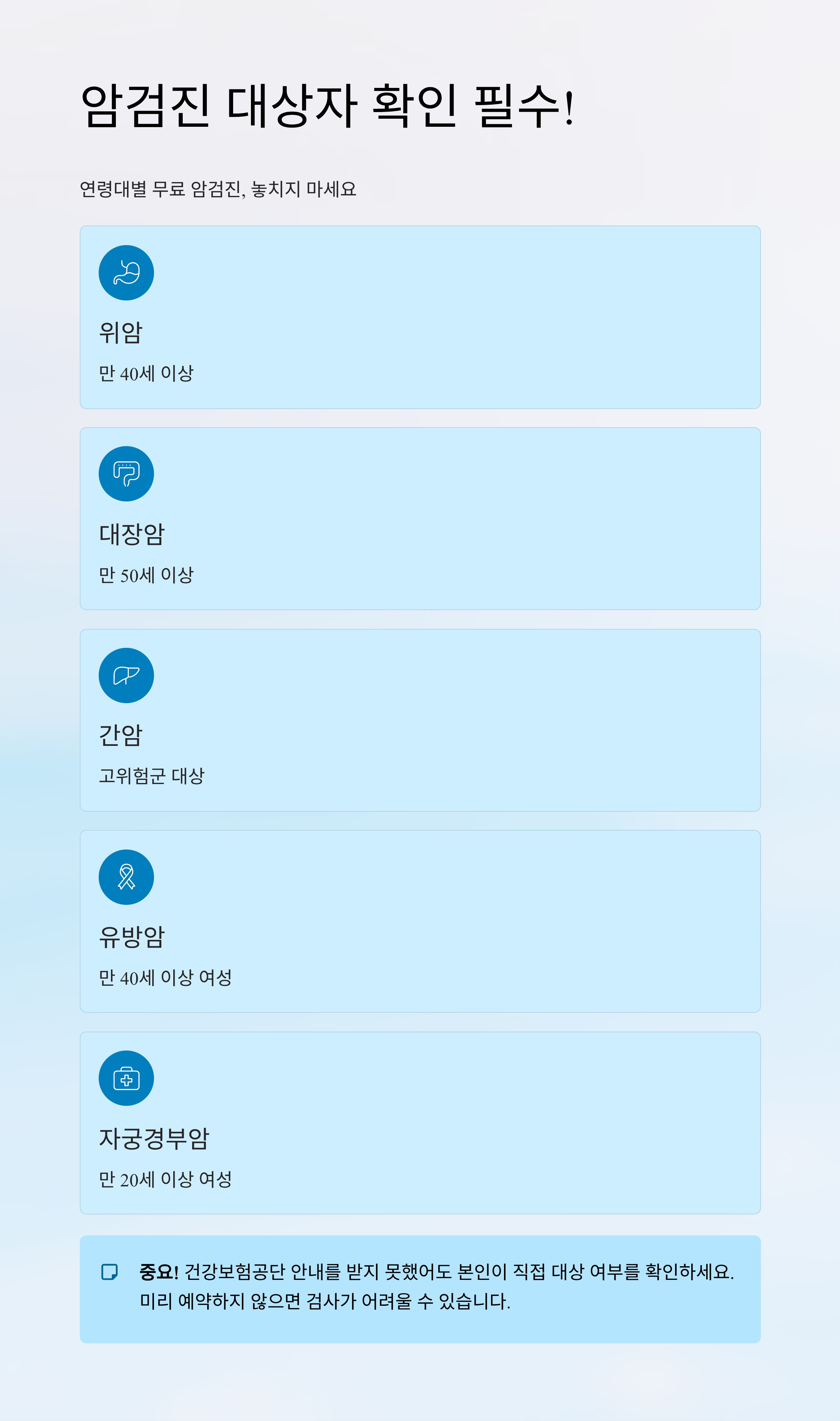 연령대별로 위암, 대장암, 간암, 유방암, 자궁경부암이 포함되며