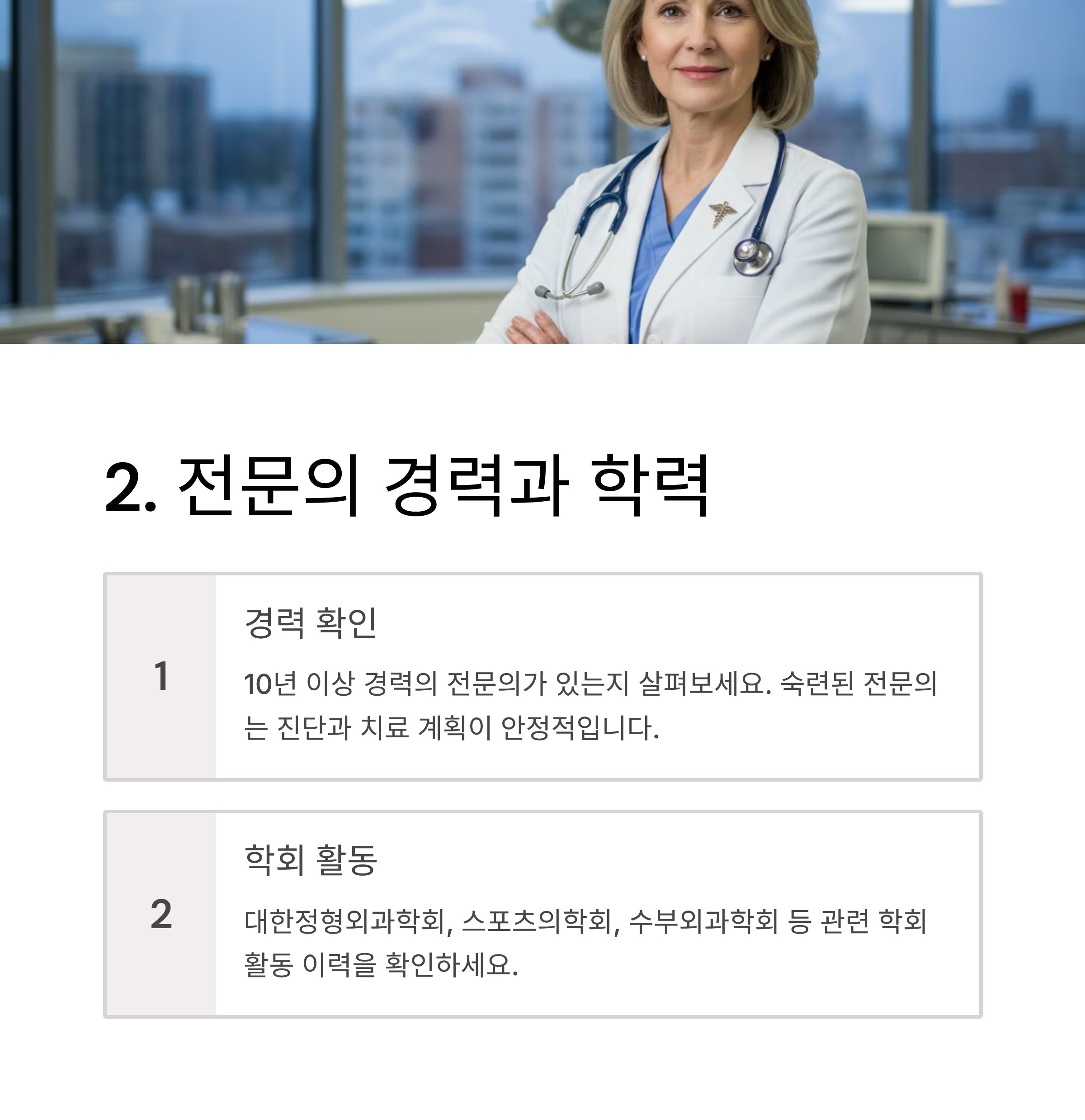 또한 대한정형외과학회, 스포츠의학회, 수부외과학회 등 관련 학회 활동도 확인해 보면 신뢰도 판단에 도움이 됩니다.
