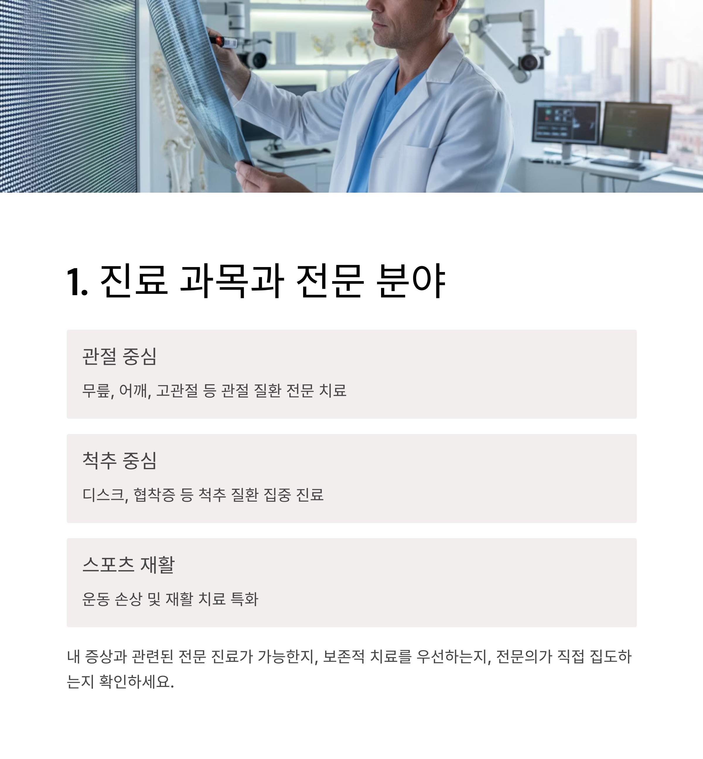 특히 수술보다는 보존적 치료를 우선하는 곳인지, 수술 시 전문의가 직접 집도하는지도 중요한 체크포인트입니다.