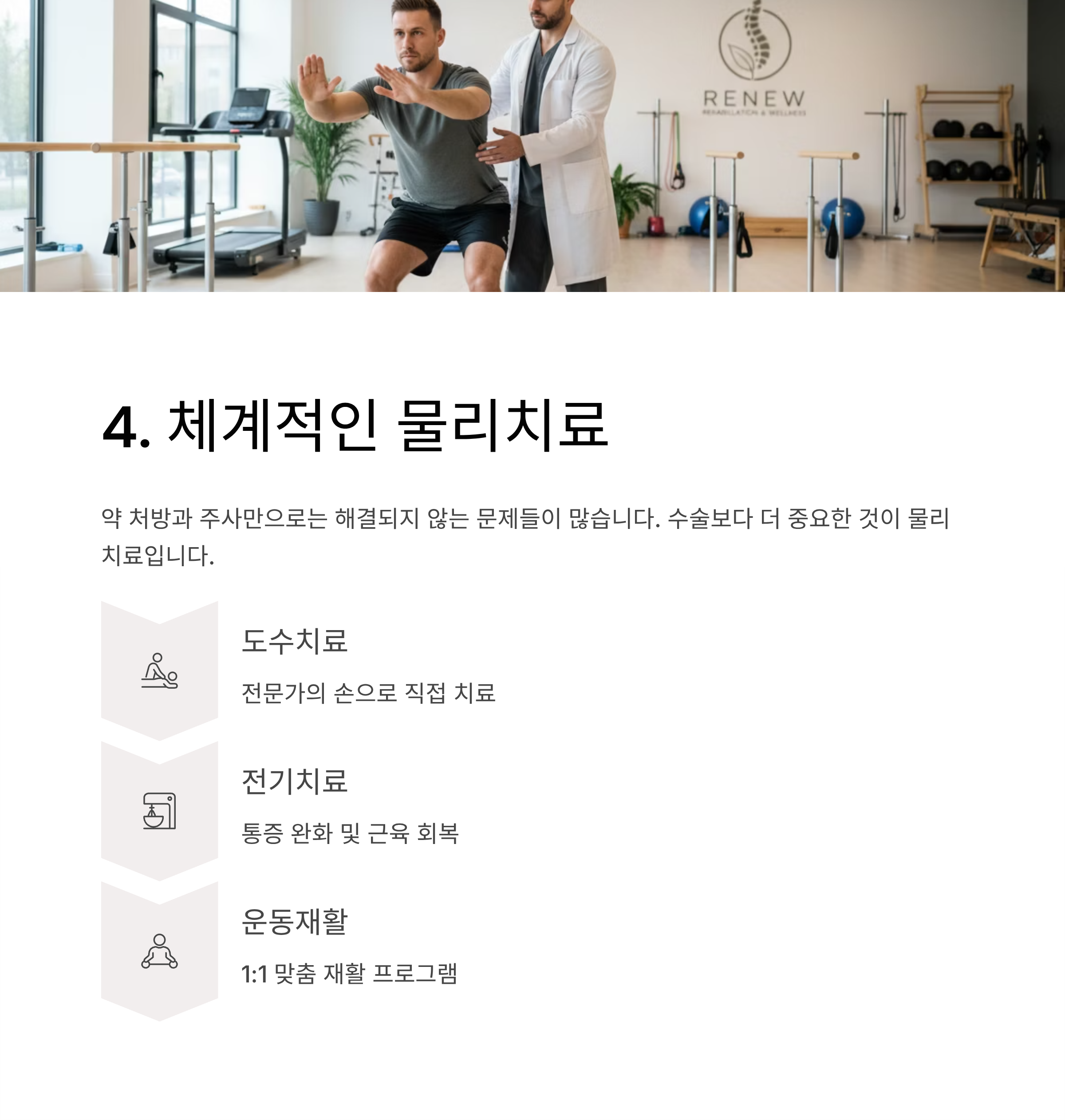 도수치료, 전기치료, 운동재활 등을 체계적으로 제공하는 병원인지 체크하세요.