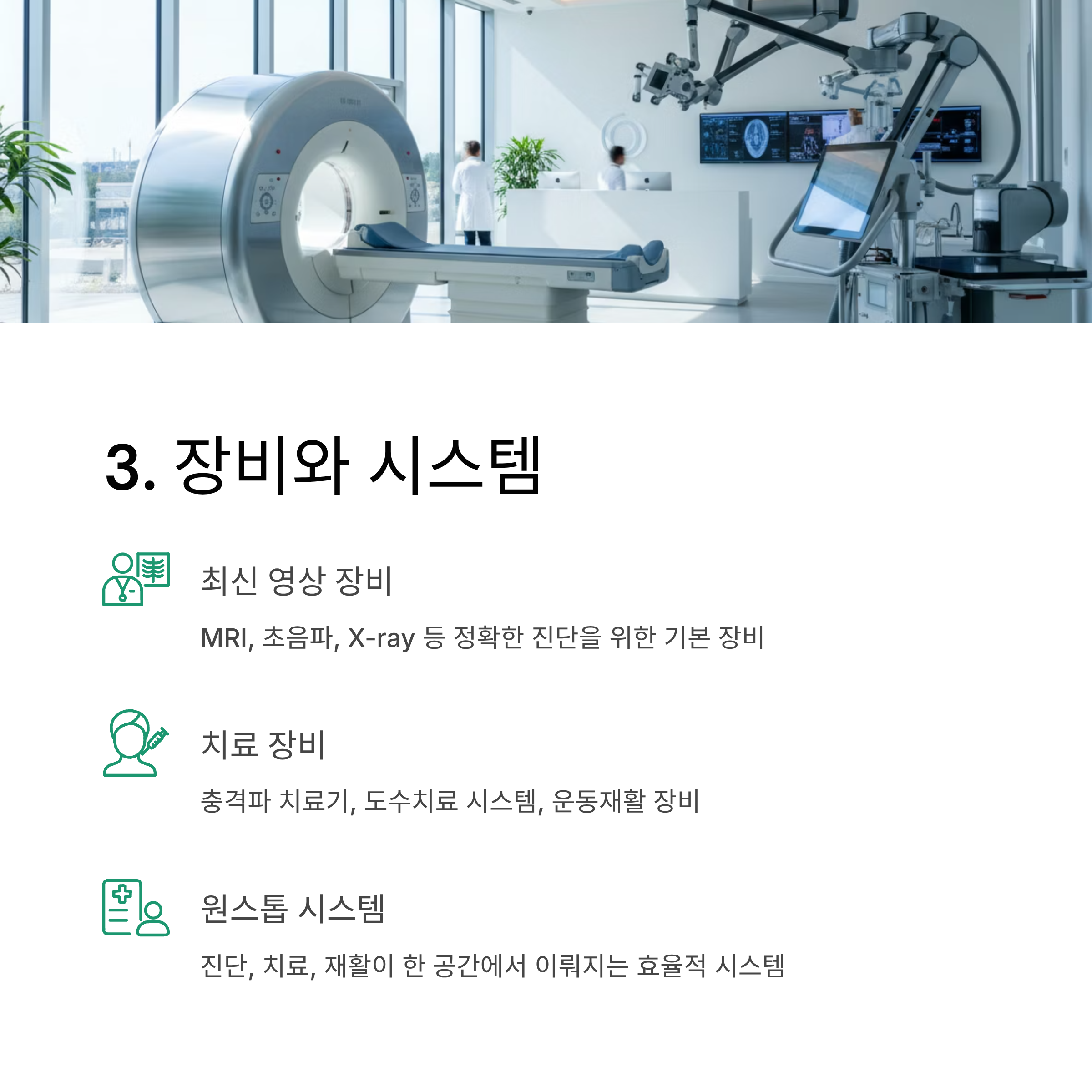 최신 영상 장비와 물리치료 시스템이 갖춰진 병원일수록 정확한 진단과 효과적인 치료가 가능합니다.