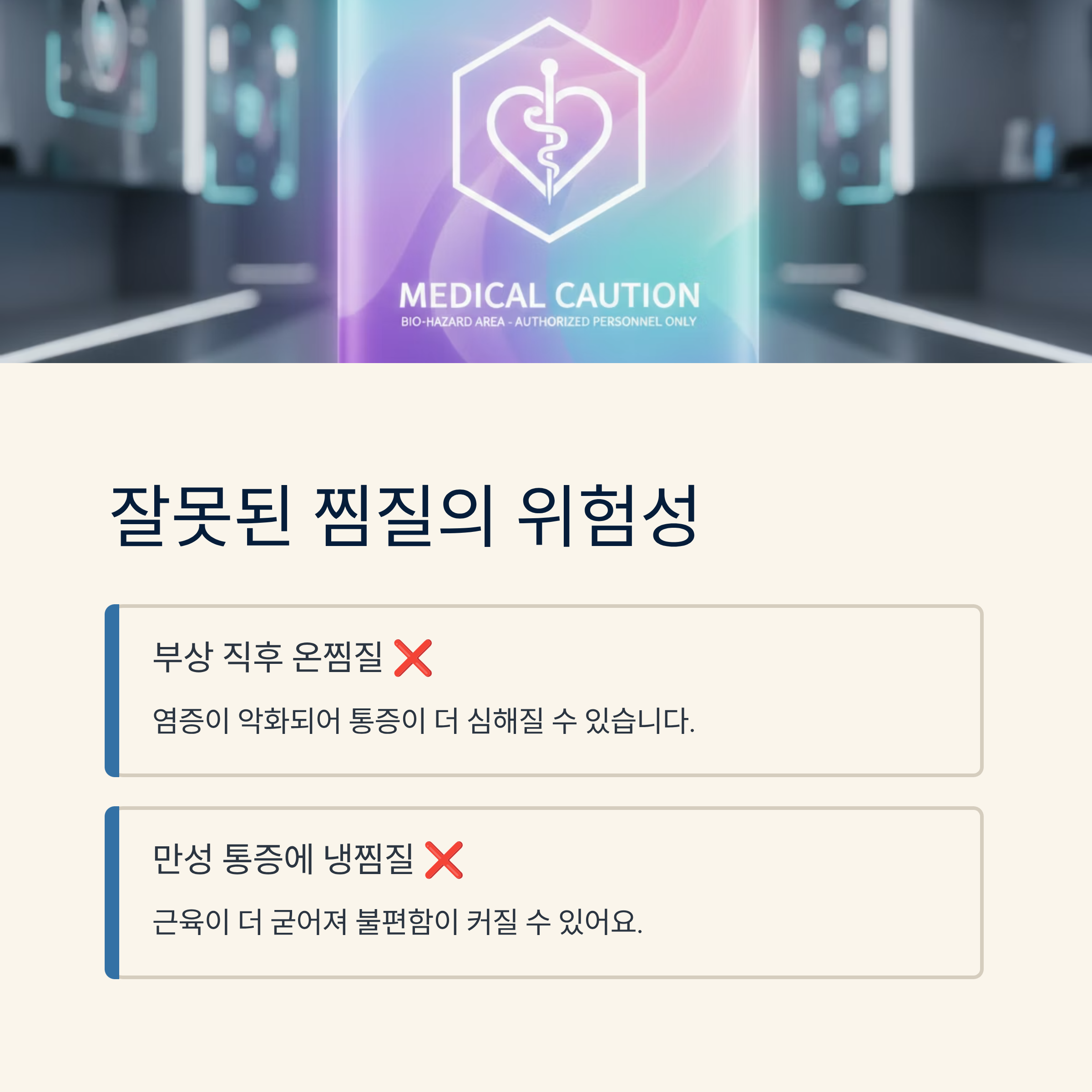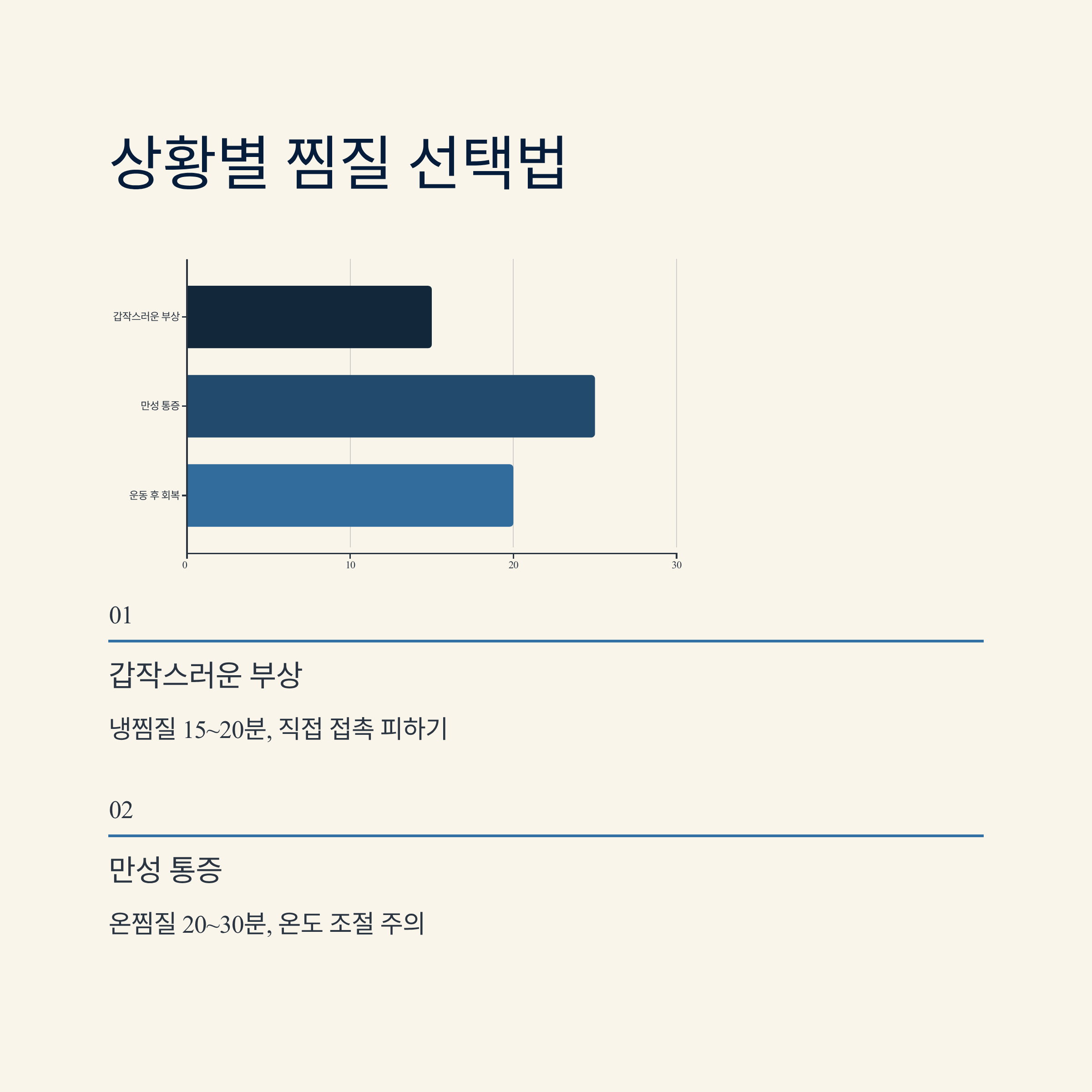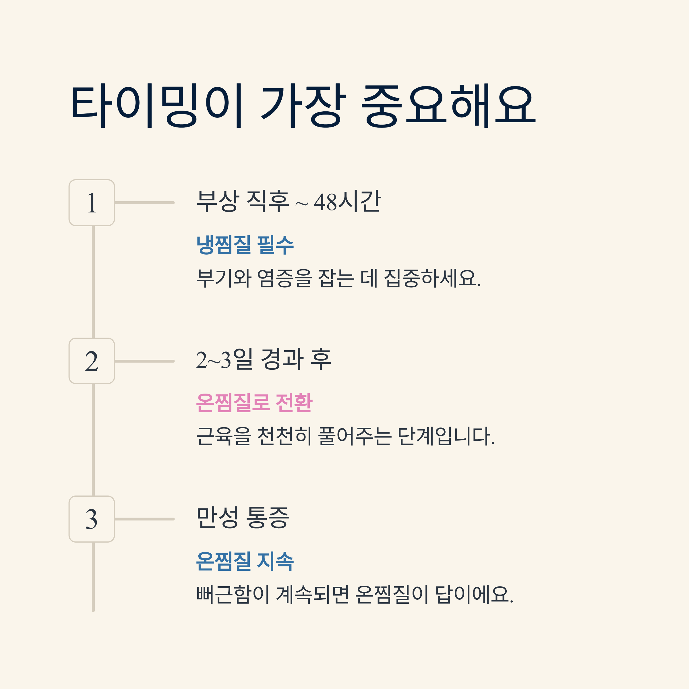 | 갑작스러운 부상 | 냉찜질 | 15~20분 | 직접 접촉은 피하세요 |