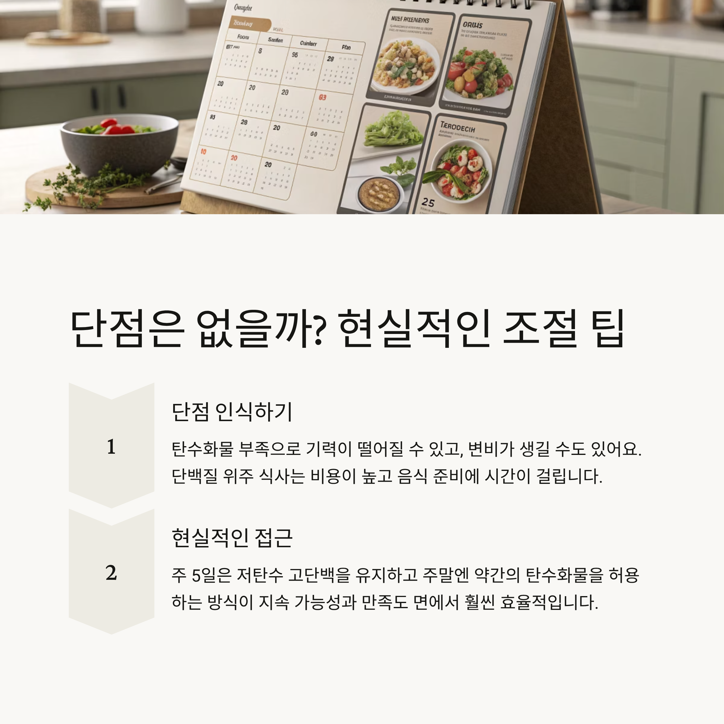 현실적으로는 주 5일은 저탄수 고단백, 주말엔 탄수화물 허용 방식을 추천합니다.