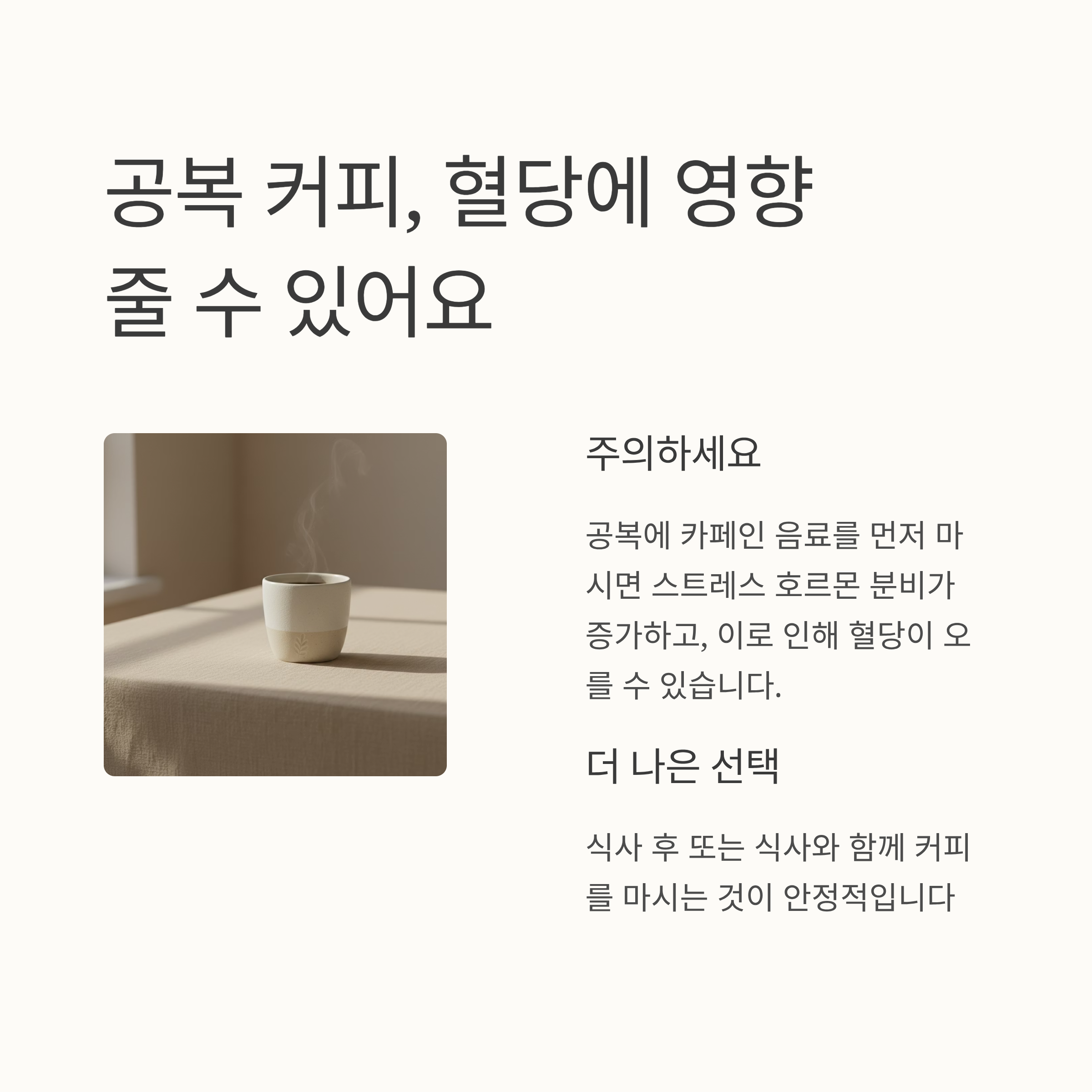 공복에 카페인 음료를 먼저 마시면 스트레스 호르몬 분비가 증가하고, 이로 인해 혈당이 오를 수 있어요.