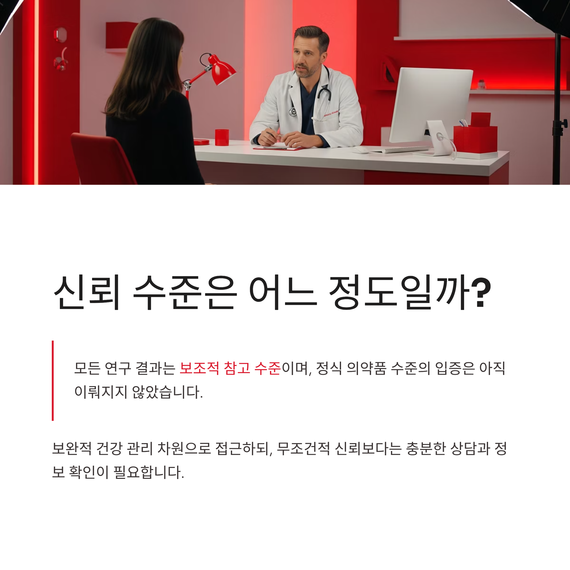 따라서 “과학적으로 검증된 효능”이라는 표현은 제한적이며, 기능성 가능성이 제시되었다는 정도로 이해하는 것이 바람직합니다.