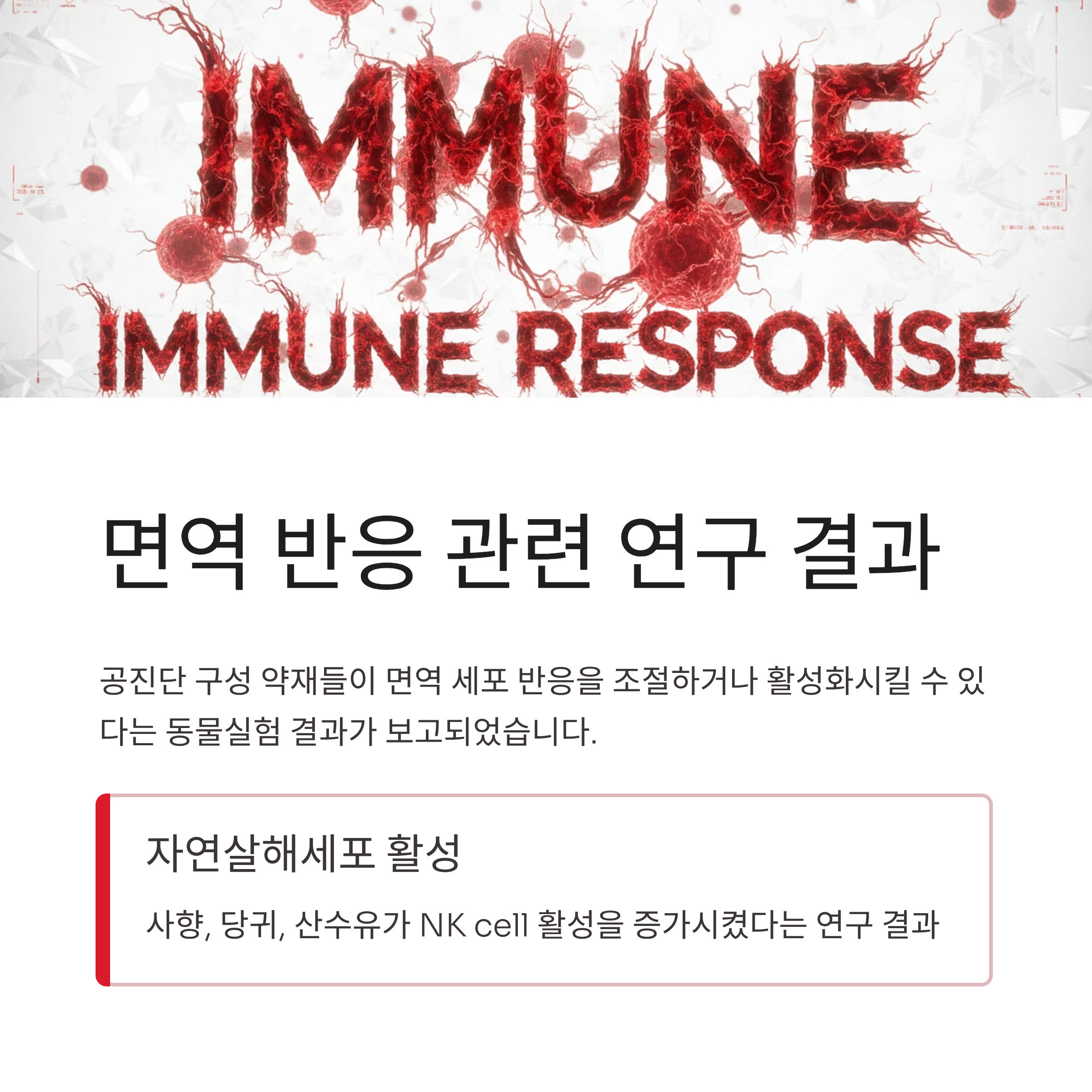 특히 사향, 당귀, 산수유 등은 자연살해세포(NK cell)의 활성을 증가시켰다는 결과가 있어, 면역 반응과 관련된 가능성이 제시되고 있습니다.