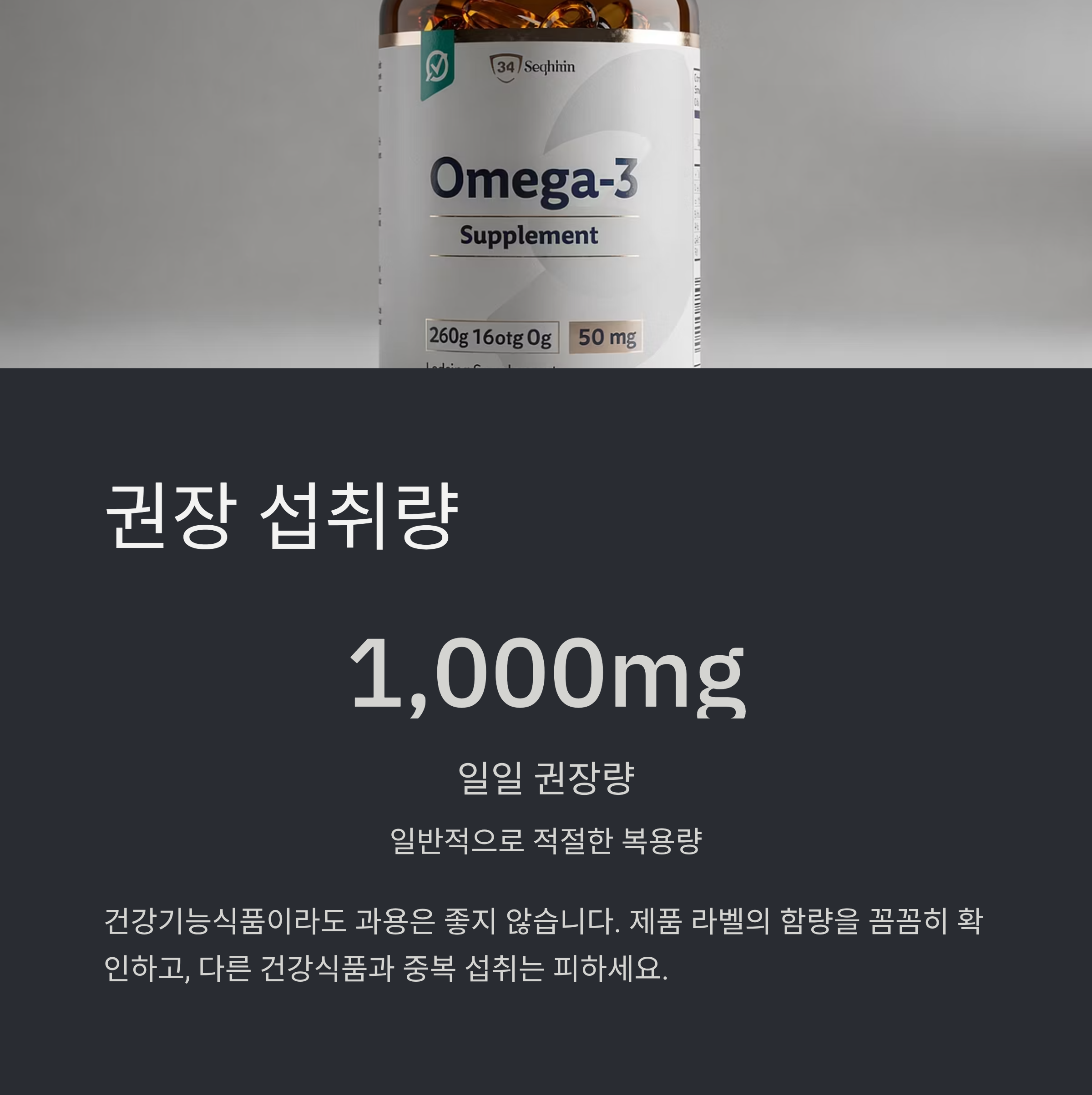 오메가3의 권장량은 제품마다 다르지만, 일반적으로 1,000mg 내외가 적절하다고 여겨집니다.