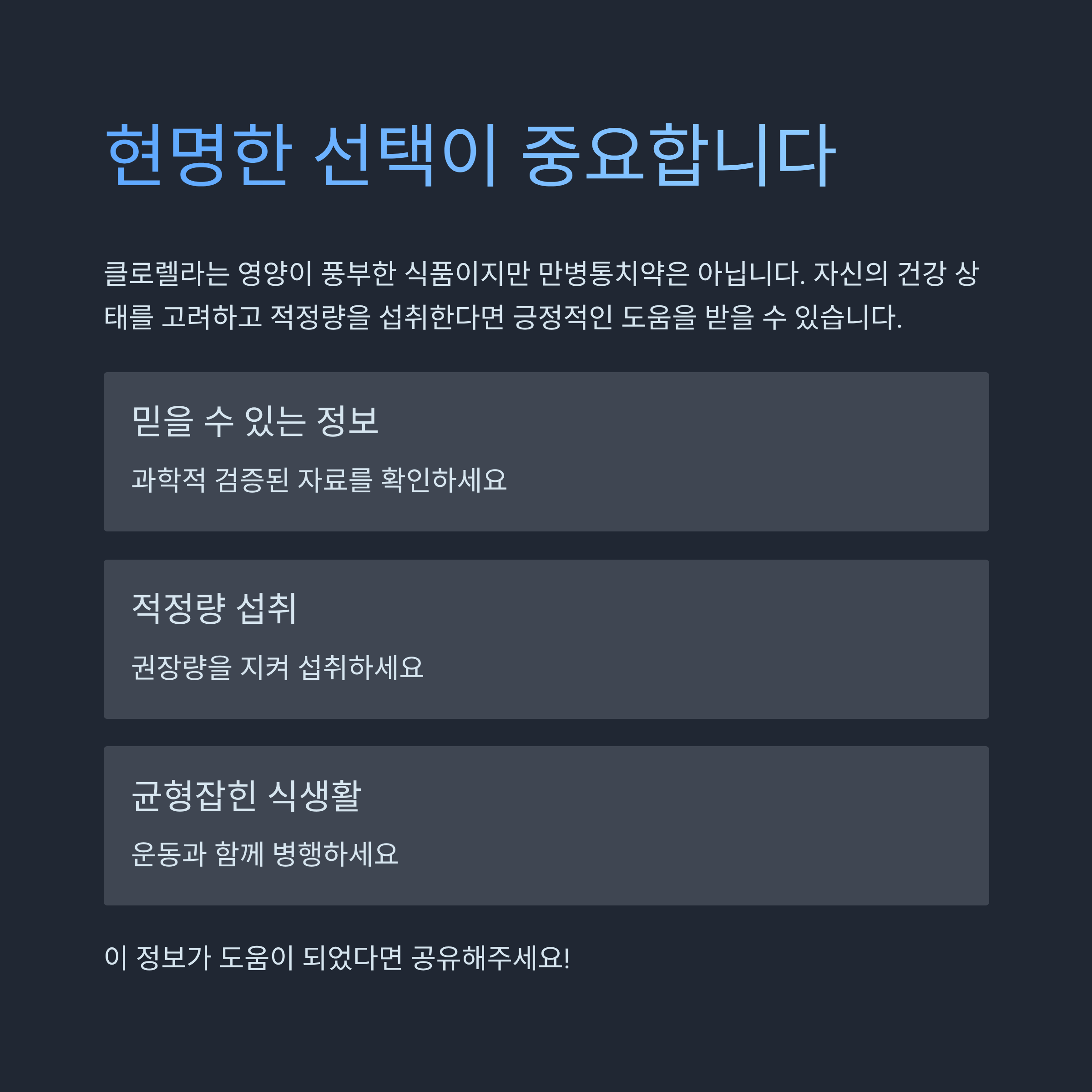 클로렐라는 분명 유익한 성분이 많은 식품이지만, 마치 모든 건강 문제를 해결해주는 만능 약처럼 여겨지는 것은 오해입니다.