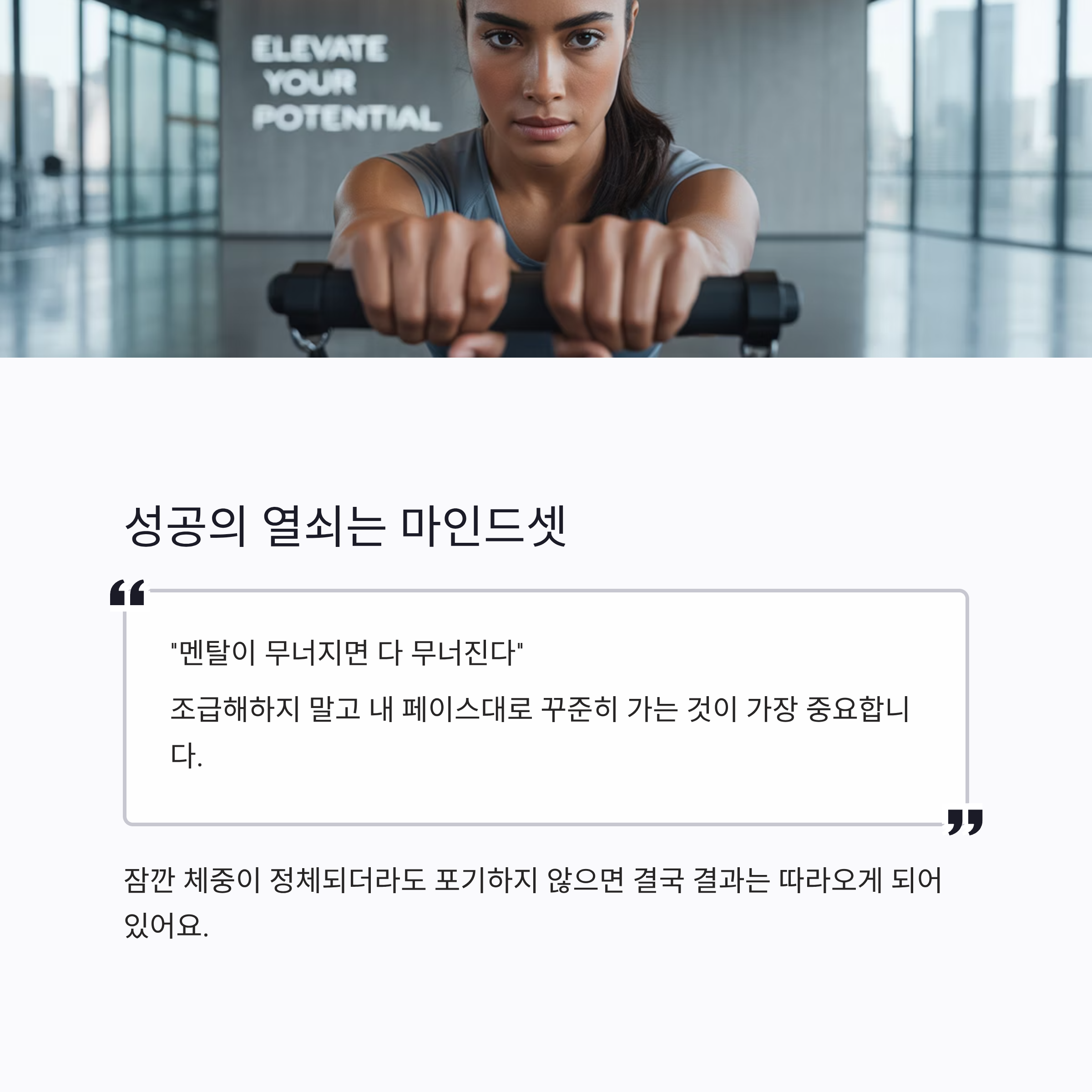 체지방 감량의 마지막 핵심은 멘탈 관리입니다. 체중 정체기에 흔들리지 말고, 비교하지 않으며 나만의 속도로 꾸준히 실천하세요. 결국 결과는 따라오게 되어 있습니다.