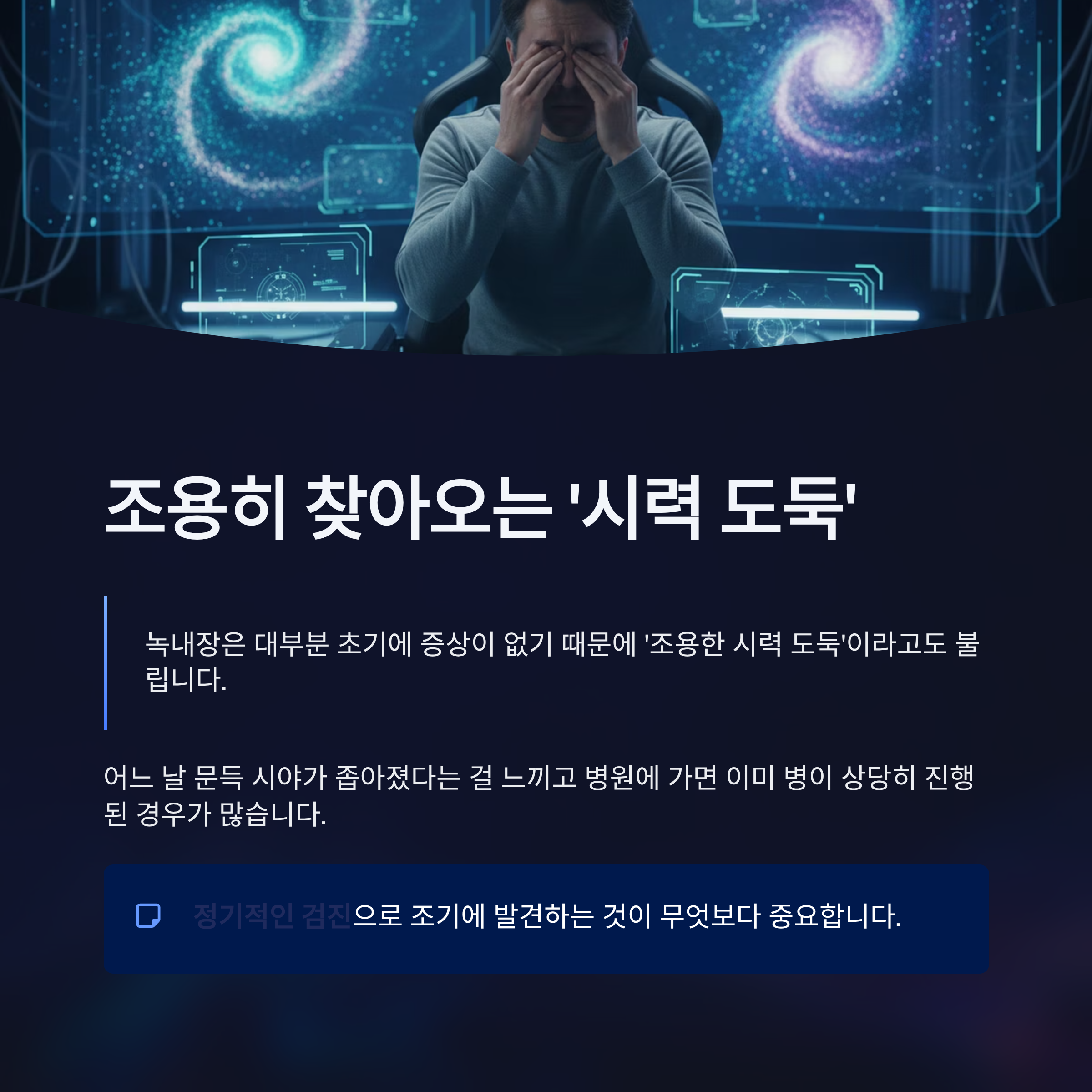 녹내장은 대부분 초기에 증상이 없기 때문에 '조용한 시력 도둑'이라고도 불립니다. 어느 날 문득 시야가 좁아졌다는 걸 느끼고 병원에 가면 이미 병이 상당히 진행된 경우가 많습니다.