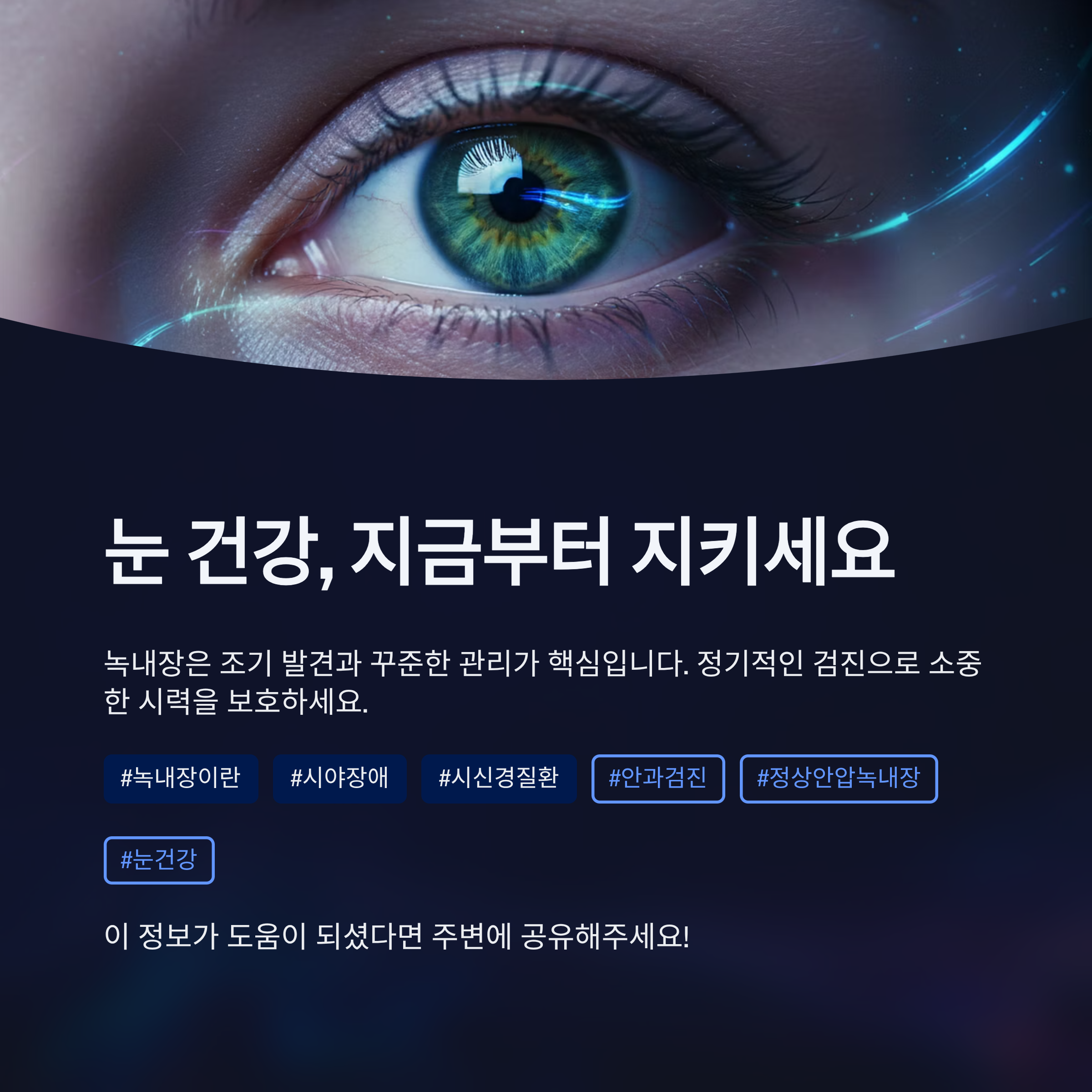 녹내장은 완치가 어려운 질환이지만, 조기에 발견해 적절히 관리하면 시력을 오랫동안 유지할 수 있습니다.