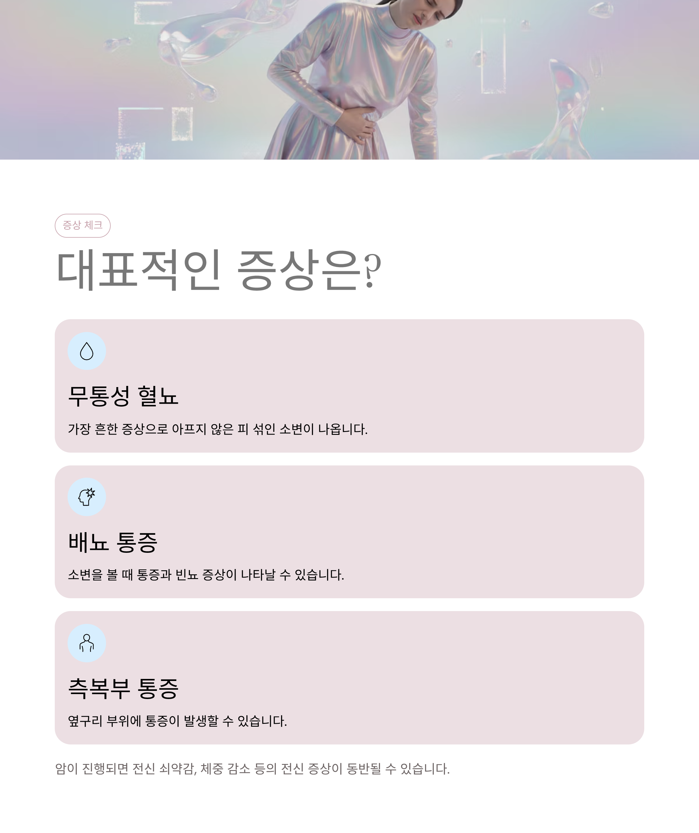 가장 흔한 증상은 무통성 혈뇨, 즉 아프지 않은 피 섞인 소변입니다.