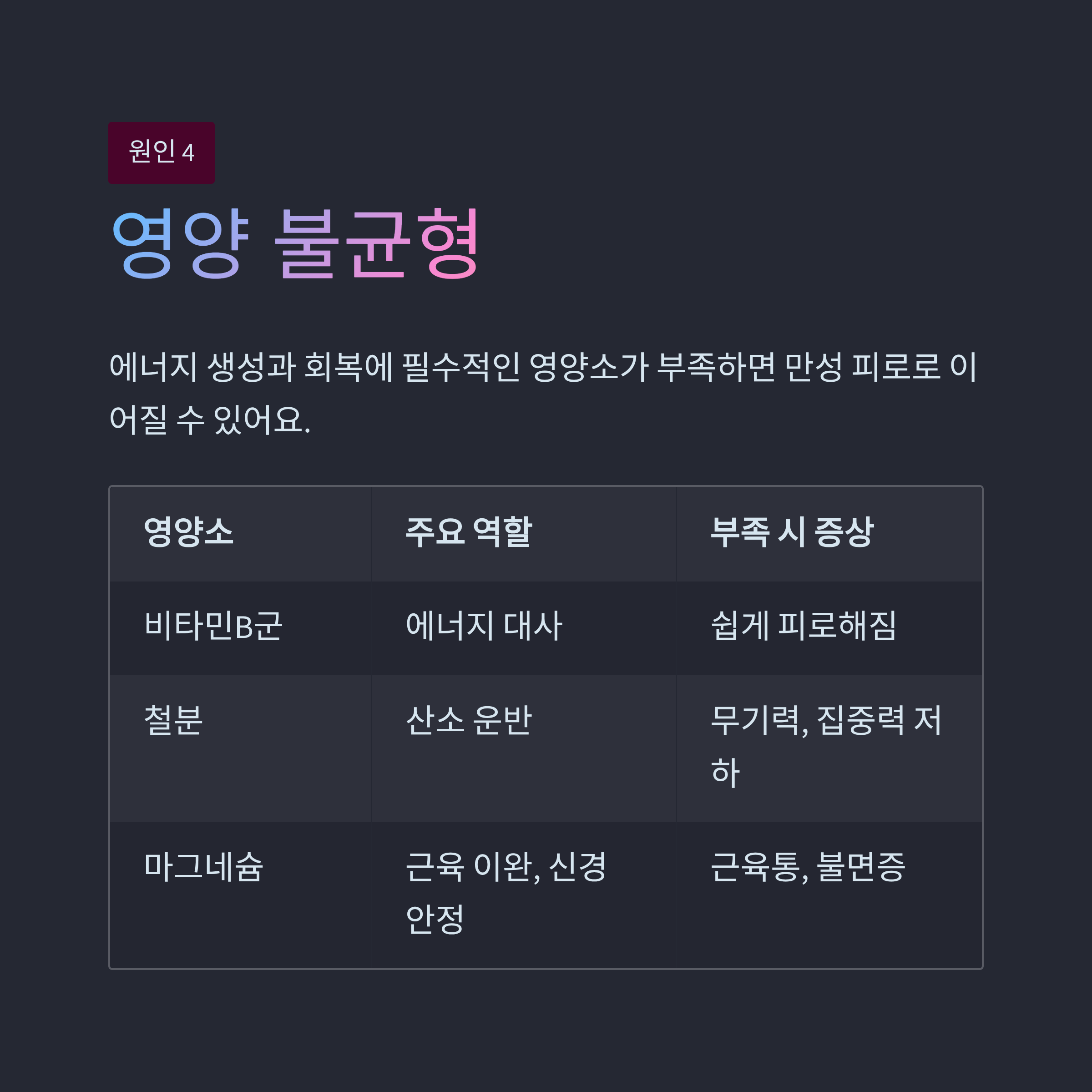 비타민B군, 철분, 마그네슘, 오메가3 등 에너지 생성과 회복에 필수적인 영양소가 부족하면 만성 피로로 이어질 수 있어요.