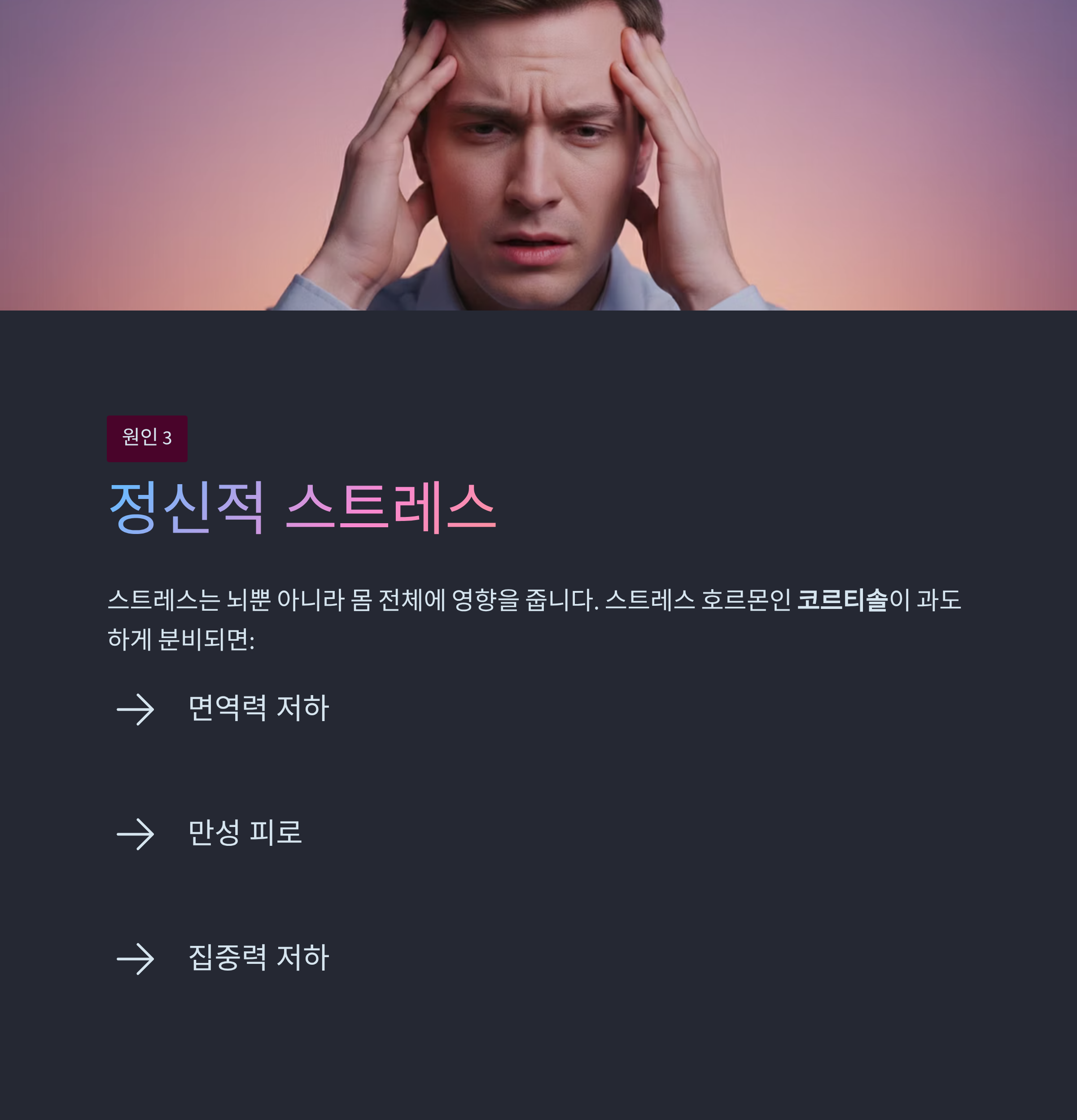 스트레스 호르몬인 코르티솔이 과도하게 분비되면 면역력 저하, 피로, 집중력 저하가 동반되죠.