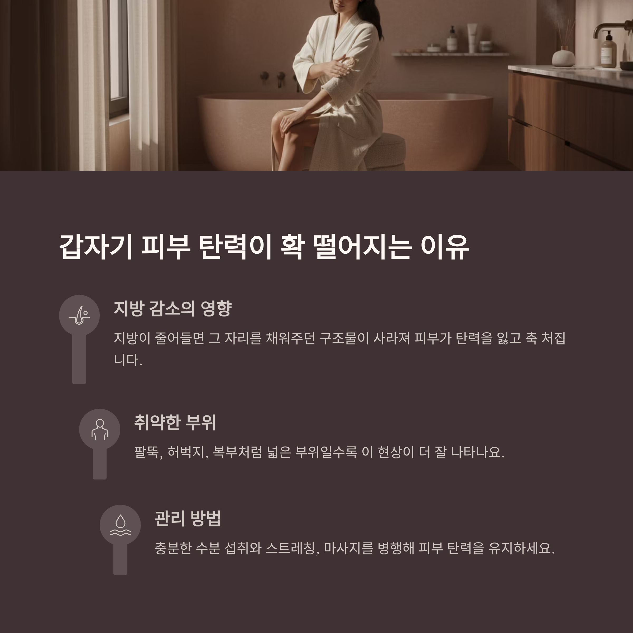 | 얼굴 | 볼살 꺼짐, 주름 증가 | 수분 섭취, 마사지 병행 |