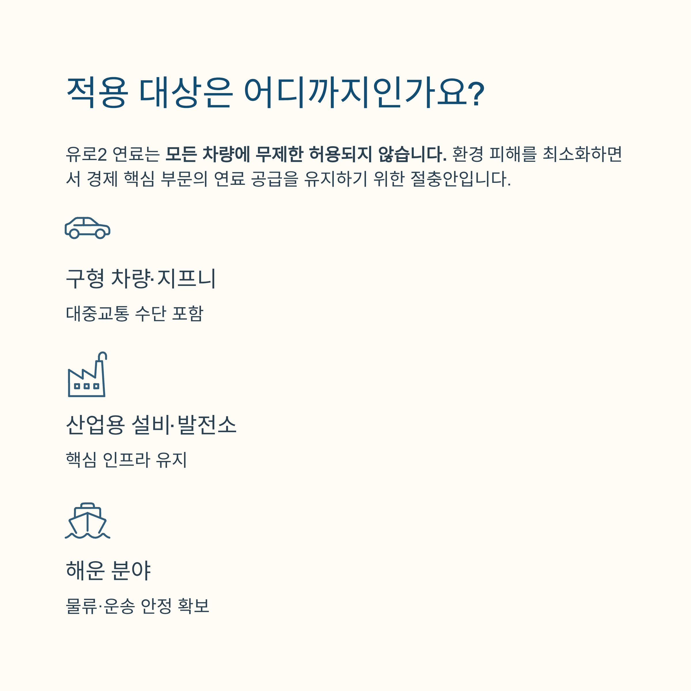 | 유로2 | 상대적으로 높음 | 구형 차량, 산업용 |