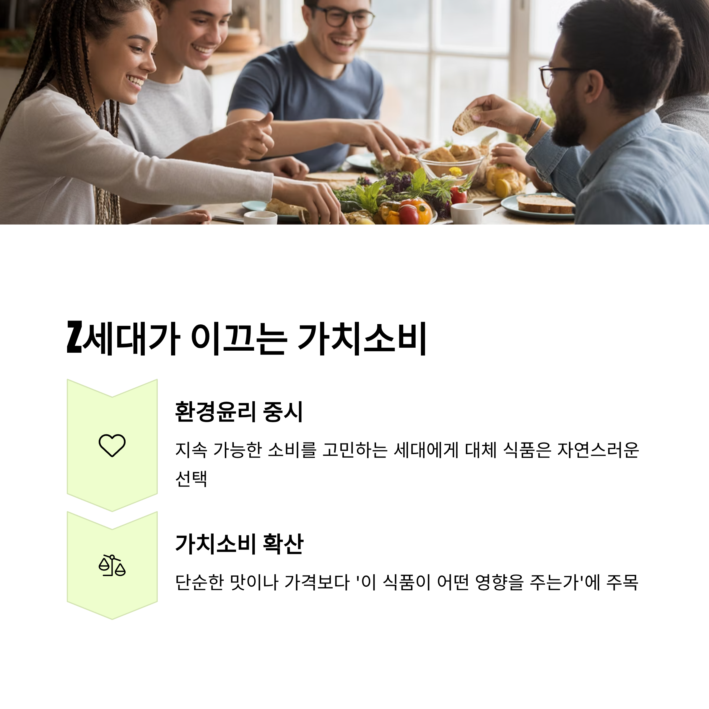 가치소비와 환경윤리에 민감한 세대는 단순한 맛이나 가격보다 ‘이 식품이 사회와 환경에 미치는 영향’을 더 중요하게 생각합니다.