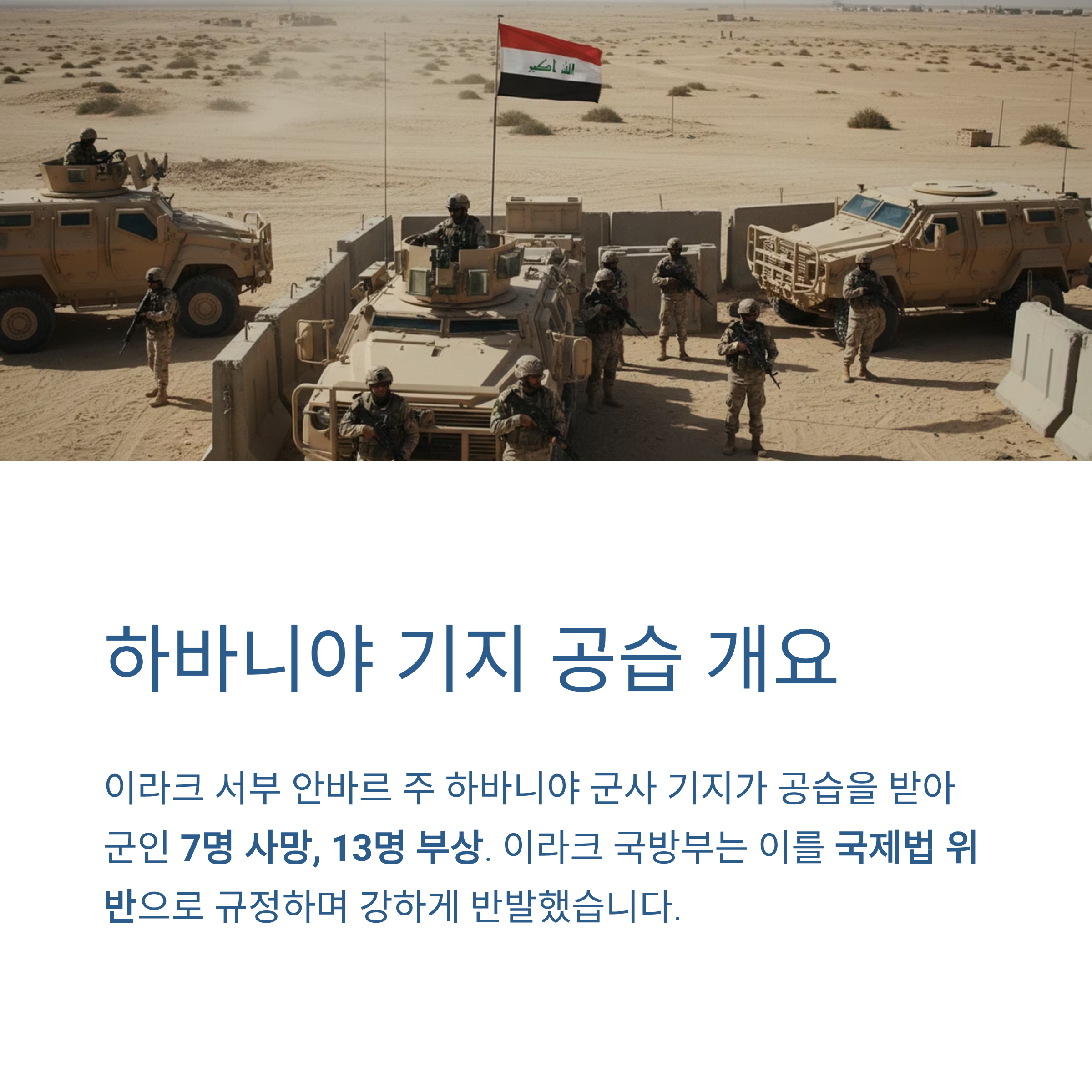 이라크 서부 안바르 주에서 발생한 공습으로 이라크 군인 7명이 숨지고 13명이 부상을 입었습니다. 이번 공격은 하바니야 군사 기지를 겨냥한 것으로 전해졌으며, 미국과 이란 간 긴장이 고조되는 가운데 발생해 중동 정세에 또 다른 파장을 예고하고 있습니다. 이라크 국방부는 이번 공습을 국제법 위반 행위라고 규정하며 강하게 반발했습니다.