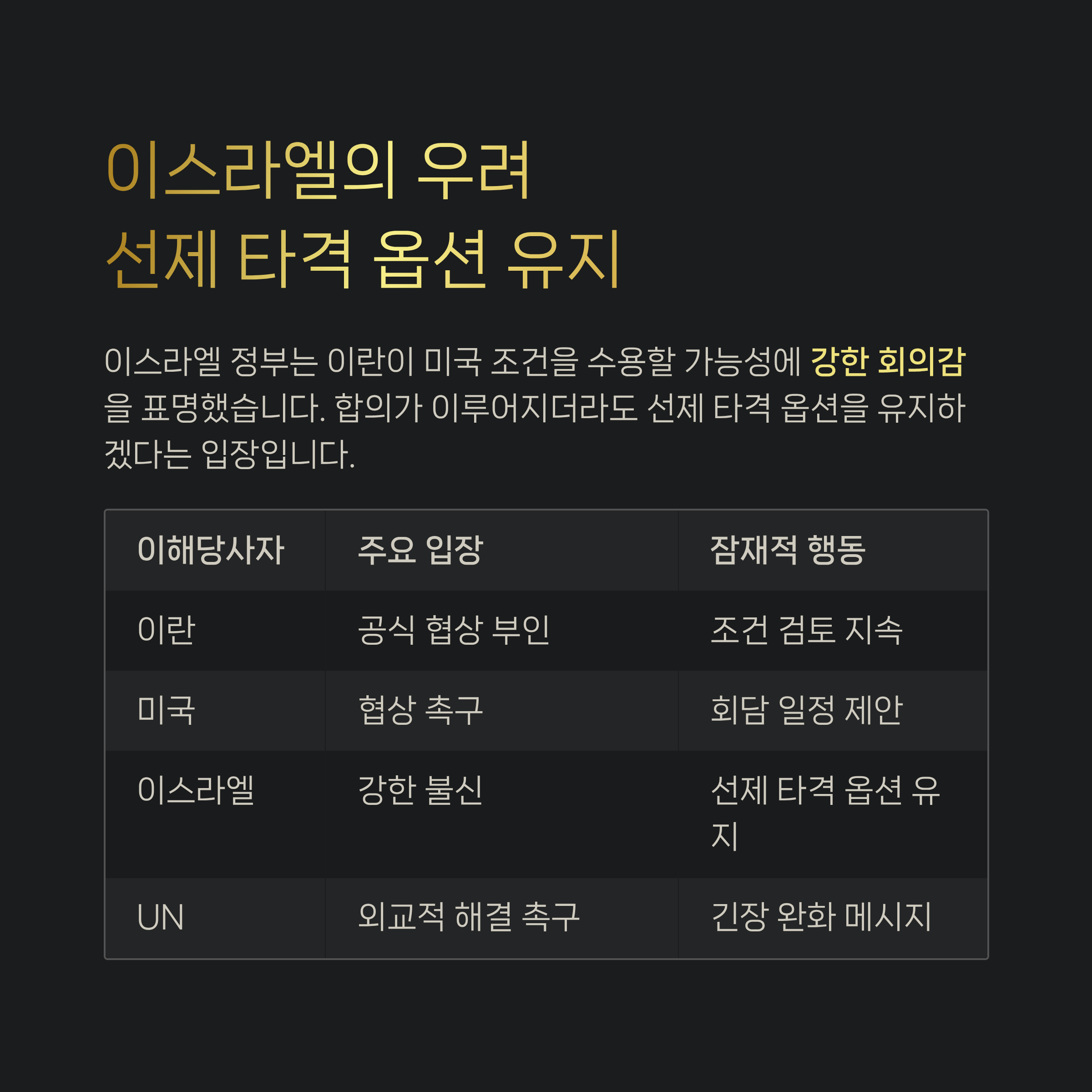 | 이스라엘 | 강한 불신 | 선제 타격 옵션 유지 |