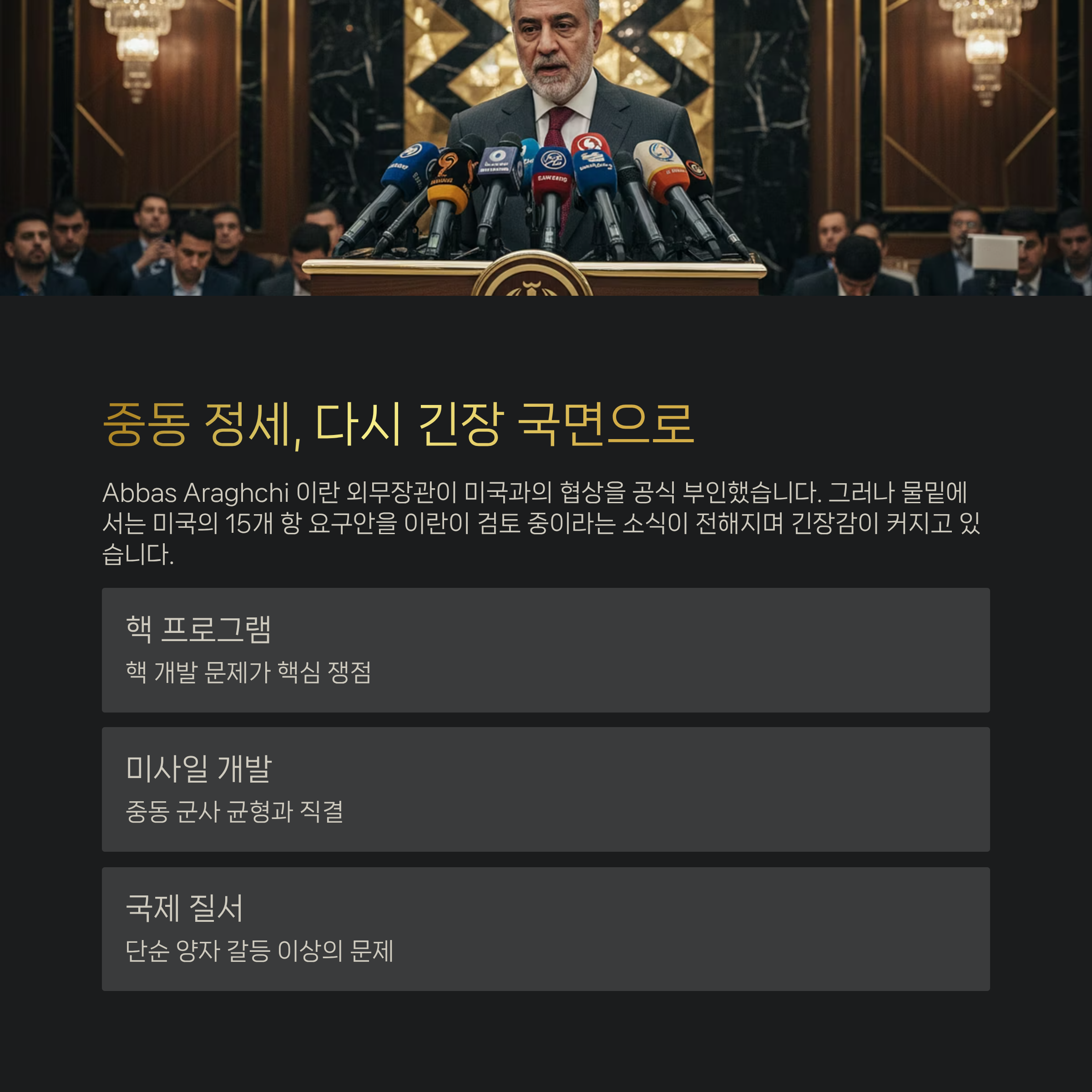 최근 중동 정세가 다시 긴장 국면으로 접어들고 있습니다. Abbas Araghchi 이란 외무장관은 “미국과 어떠한 협상도 계획하고 있지 않다”고 공식적으로 밝혔습니다. 그러나 물밑에서는 미국이 제시한 15개 항의 요구안을 이란이 검토 중이라는 소식이 전해지면서 외교적 긴장감이 커지고 있습니다.