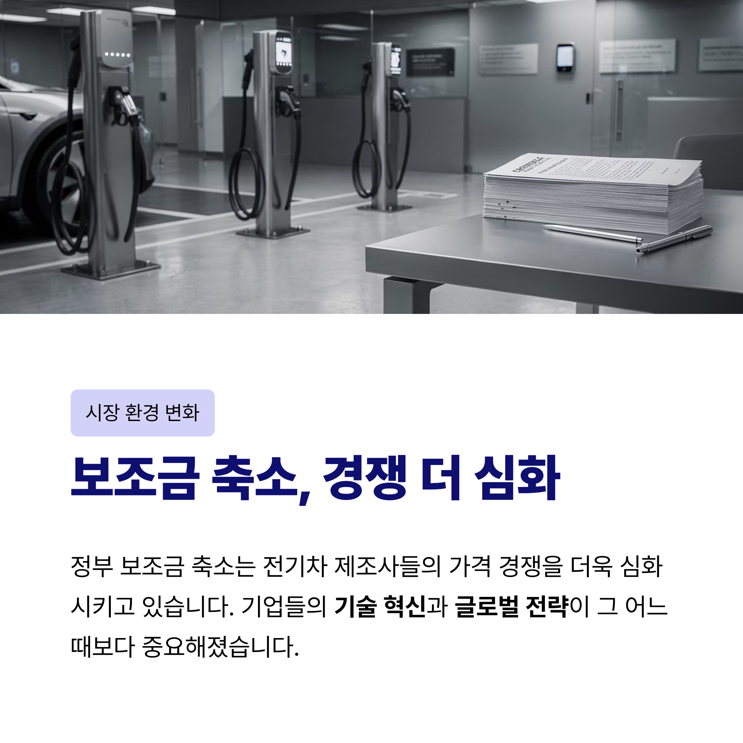 정부 보조금 축소는 전기차 제조사들의 가격 경쟁을 더욱 심화시키며 수익성에 부담을 주고 있습니다. 이러한 변화는 기업들의 기술 혁신과 글로벌 전략을 더욱 중요하게 만들고 있습니다.