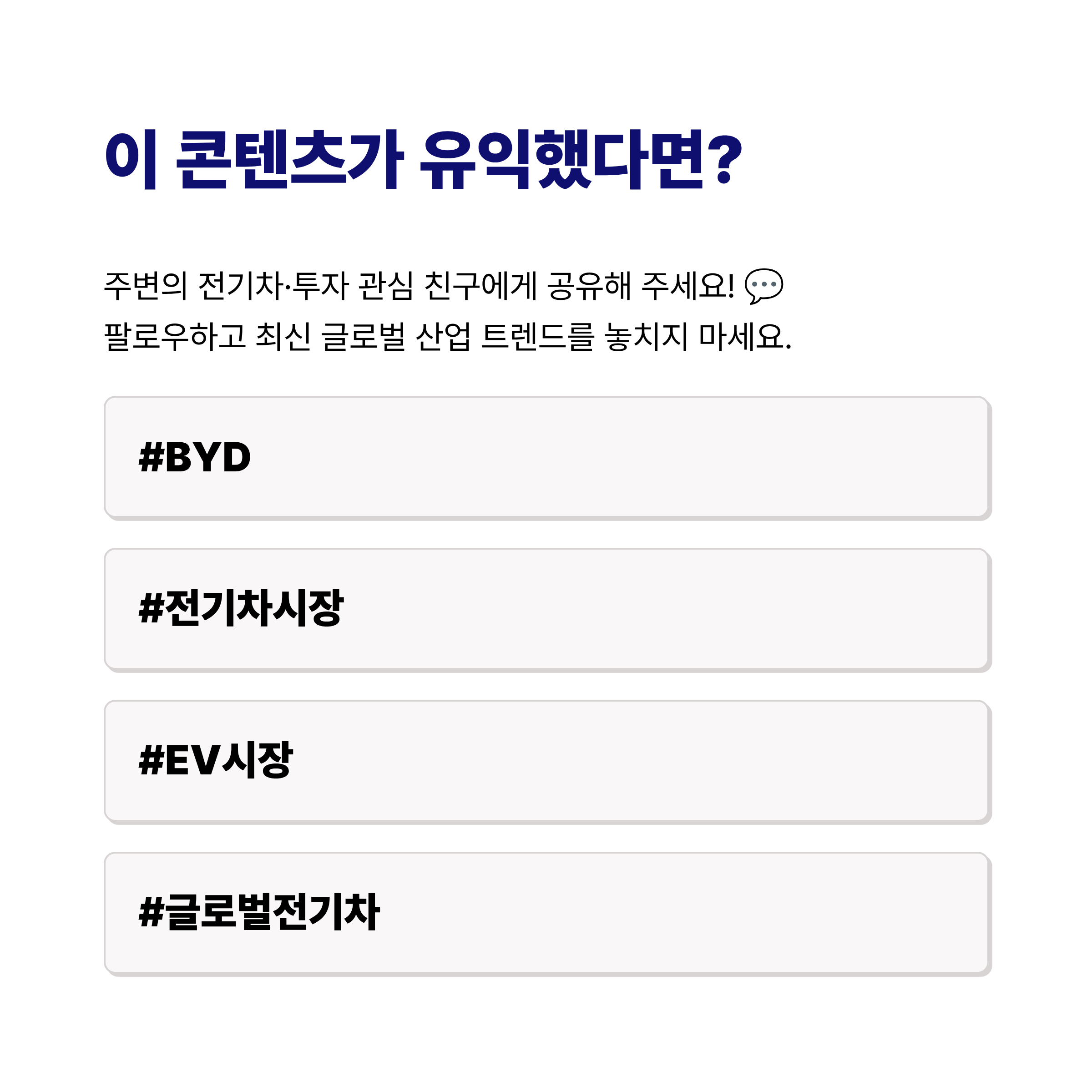 단기적인 이익 감소에도 불구하고 BYD는 매출 성장과 해외 확장을 통해 장기적인 성장 가능성을 유지하고 있습니다. 전기차 산업의 핵심 기업으로서 향후 시장의 주도권을 이어갈 것으로 기대됩니다.