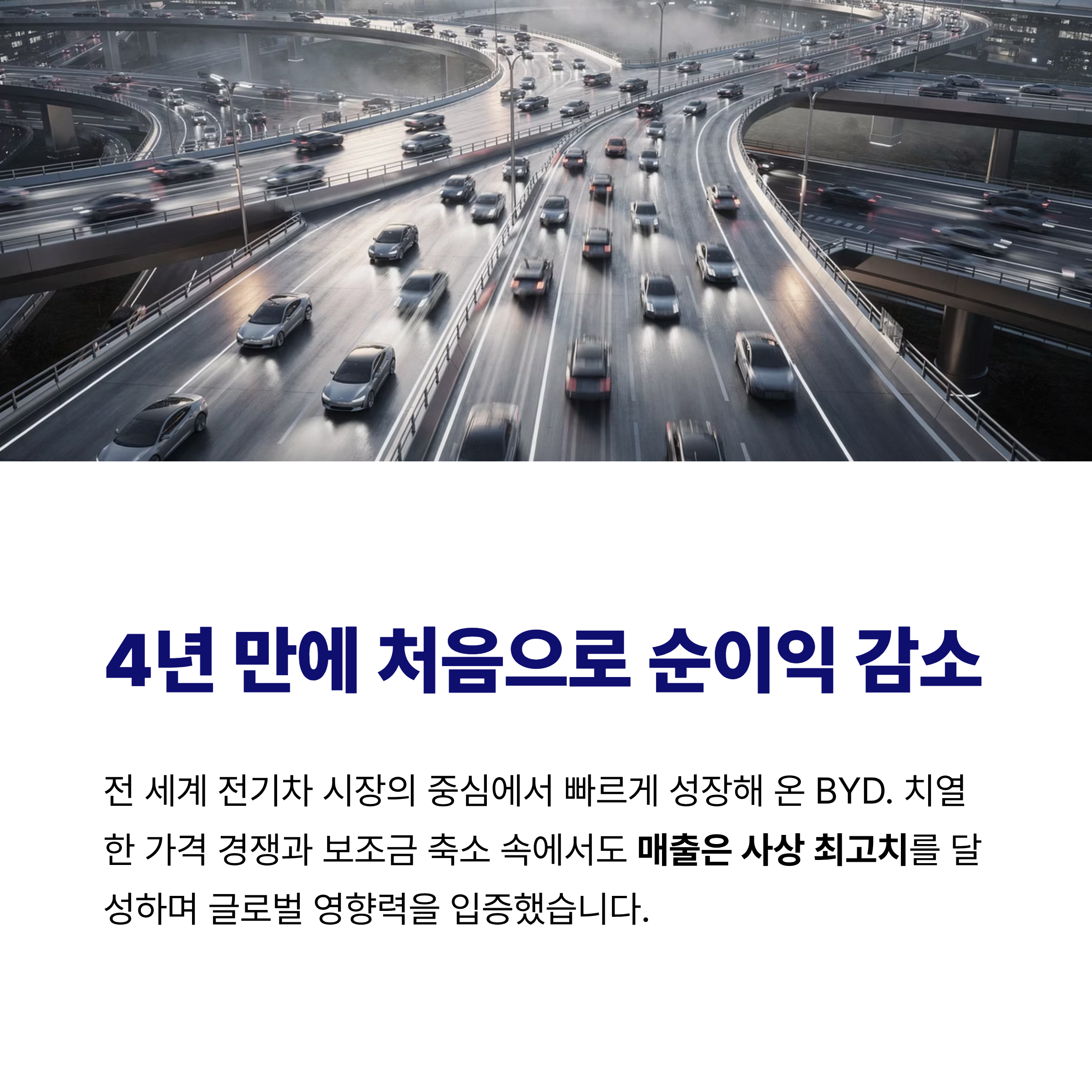 전 세계 전기차 시장의 중심에서 빠르게 성장해 온 BYD가 4년 만에 처음으로 연간 순이익 감소를 기록하며 산업 전반의 긴장감을 높이고 있습니다. 치열한 가격 경쟁과 보조금 축소라는 변수 속에서도 매출은 사상 최고치를 달성하며 글로벌 시장에서의 영향력을 입증했습니다.