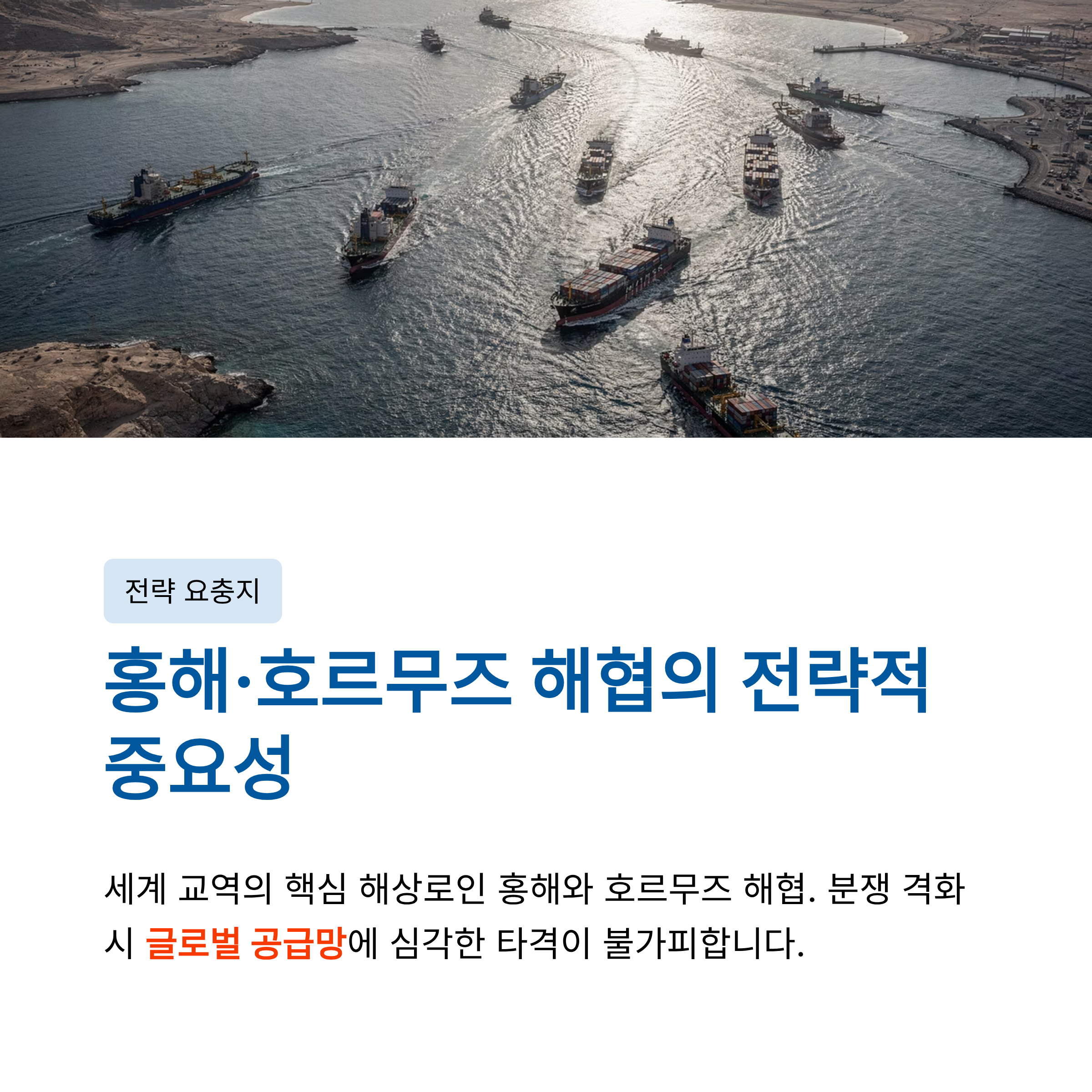 홍해와 호르무즈 해협은 세계 교역의 핵심 해상로로, 분쟁이 격화될 경우 글로벌 공급망에 심각한 영향을 미칠 수 있습니다. 이 지역의 불안정성은 국제 경제에 직접적인 부담으로 작용합니다.