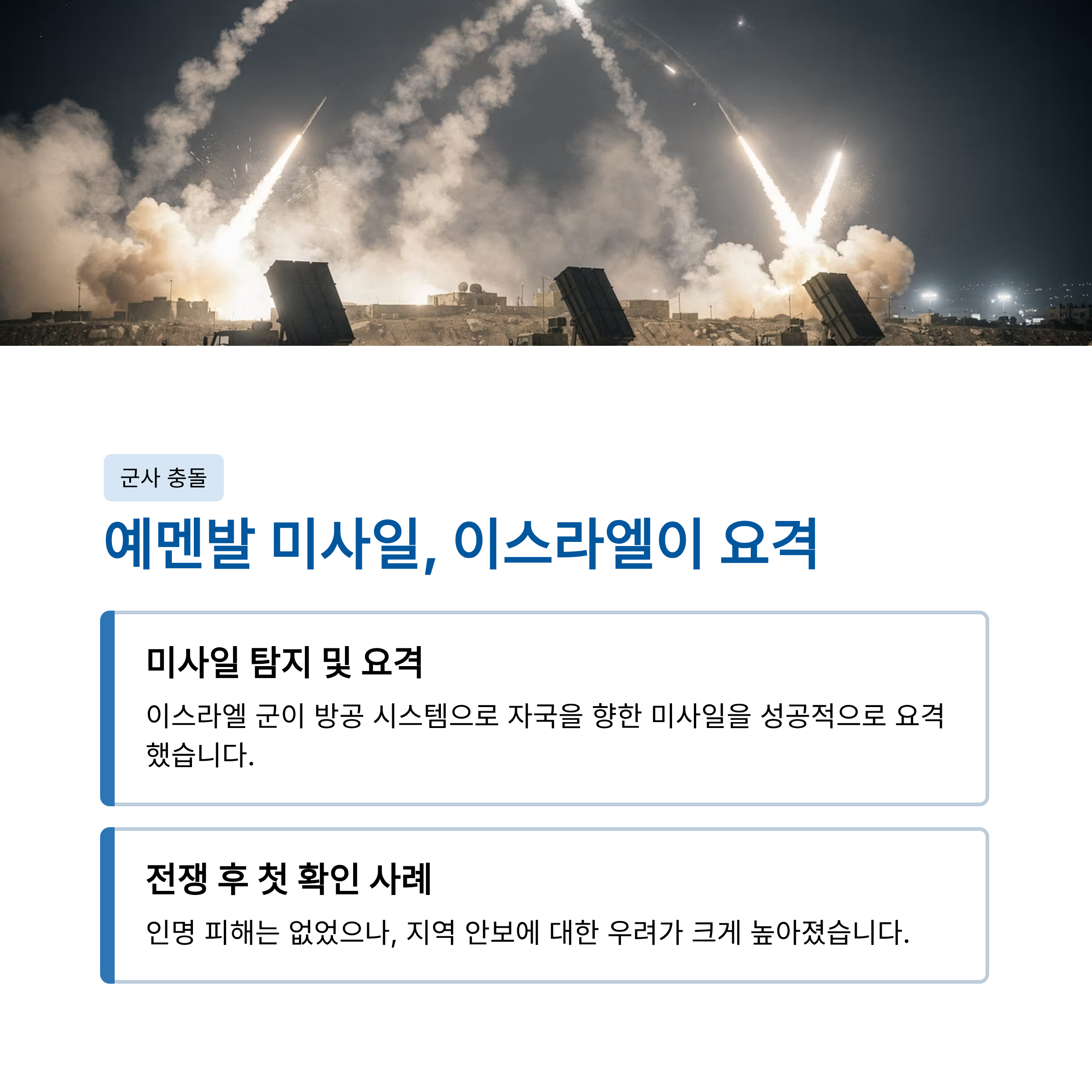 이스라엘과 예멘 사이의 긴장이 고조된 가운데, 이스라엘 군은 자국 영토를 향해 발사된 미사일을 탐지하고 방공 시스템으로 요격했다고 밝혔습니다. 이번 공격은 전쟁 발발 이후 처음으로 확인된 사례로, 인명 피해는 발생하지 않았지만 지역 안보에 대한 우려를 키우고 있습니다.