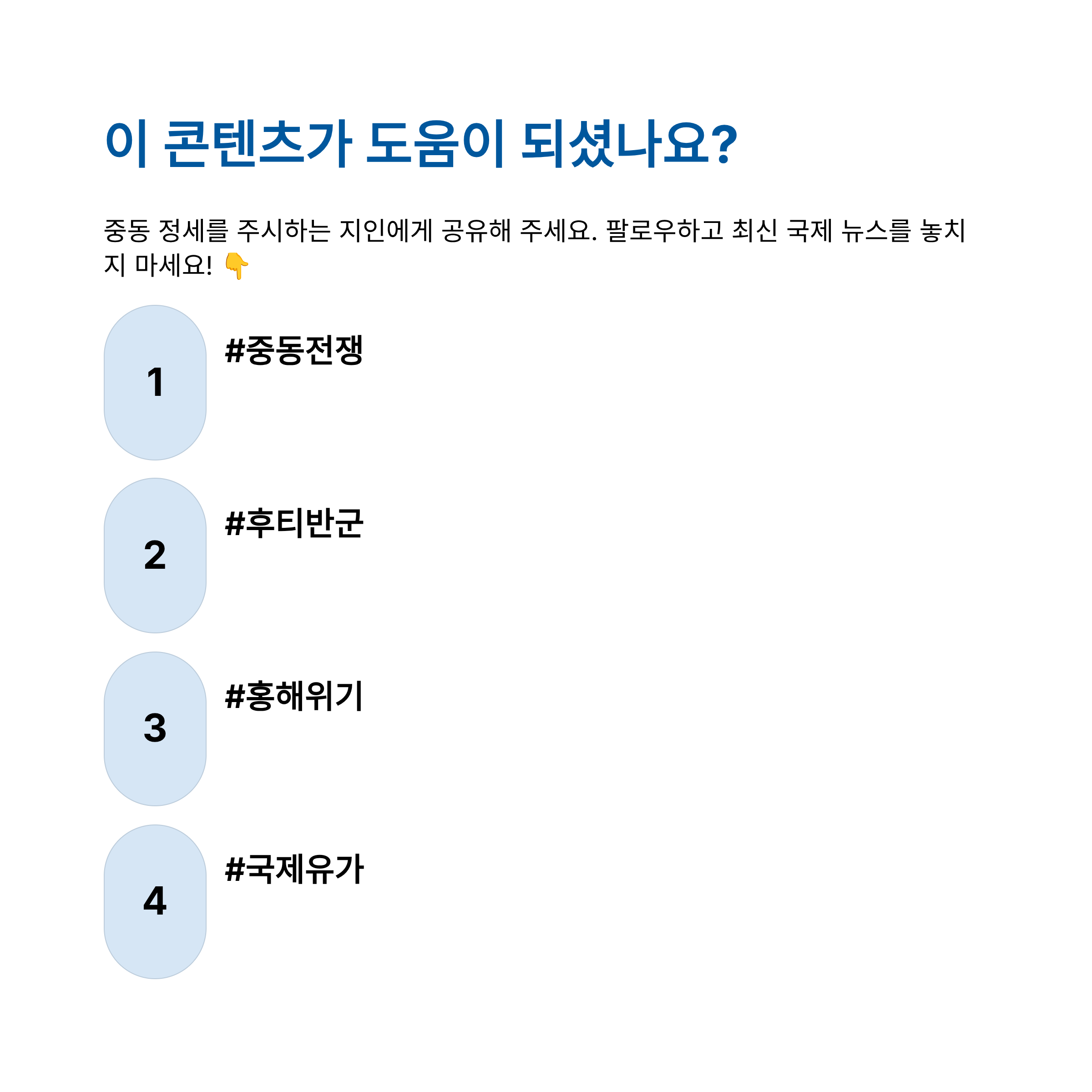 이번 사태는 단순한 지역 분쟁을 넘어 국제 정치와 경제 질서에 중대한 변화를 예고하고 있습니다. 중동의 긴장이 장기화될수록 세계는 더욱 복잡한 안보 환경에 직면하게 될 것입니다.