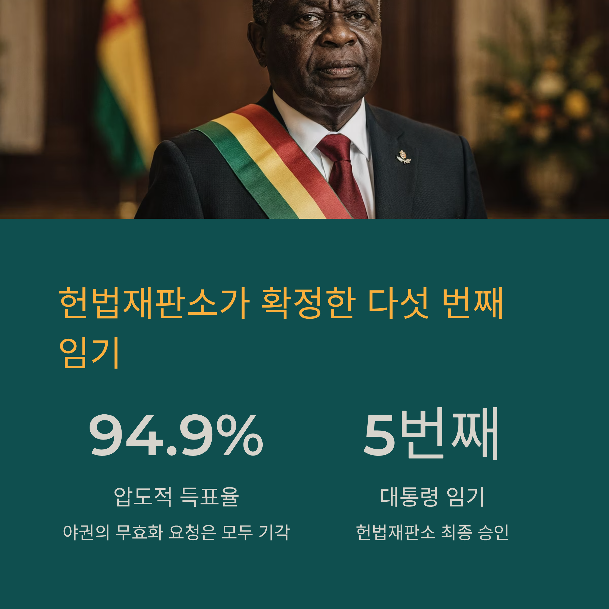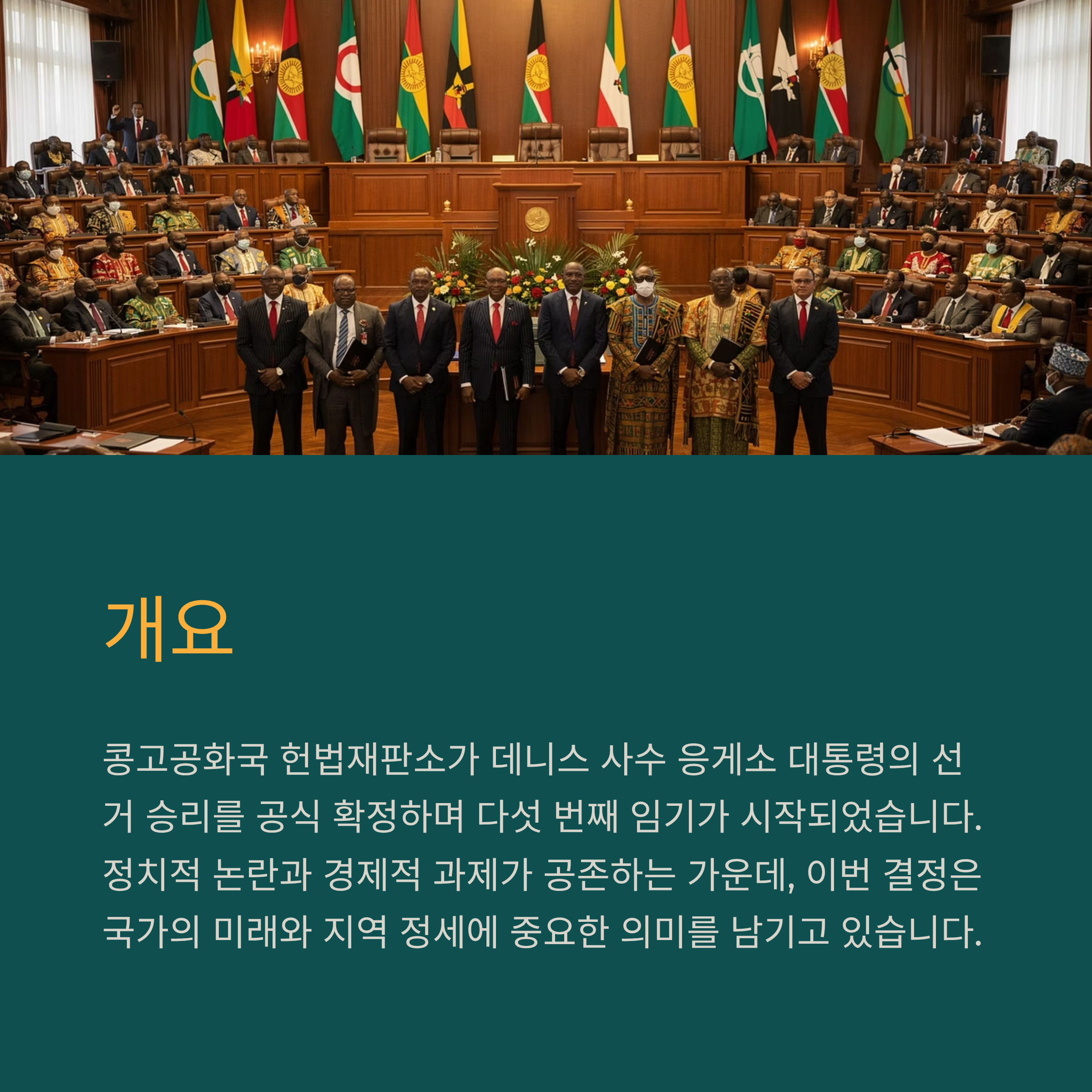 콩고공화국 헌법재판소가 데니스 사수 응게소 대통령의 선거 승리를 공식 확정하며 다섯 번째 임기가 시작되었습니다. 압도적인 득표율과 함께 이어진 이번 결과는 아프리카 정치 지형 속 장기 집권의 흐름을 다시금 조명하게 합니다. 정치적 논란과 경제적 과제가 공존하는 가운데, 이번 결정은 국가의 미래와 지역 정세에 중요한 의미를 남기고 있습니다.