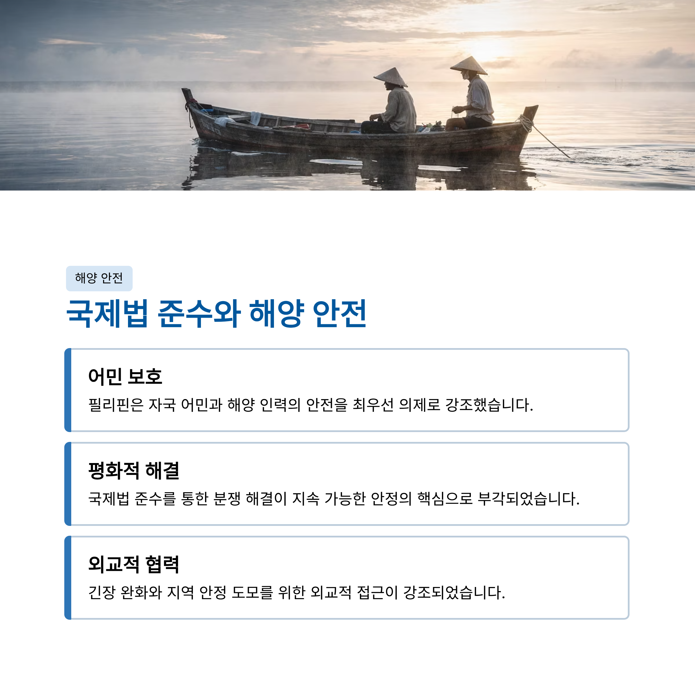 필리핀은 자국 어민과 해양 인력의 안전을 강조하며 국제법 준수를 촉구했습니다. 평화적 해결을 위한 외교적 접근은 남중국해의 지속 가능한 안정을 위한 핵심 요소로 부각되었습니다.