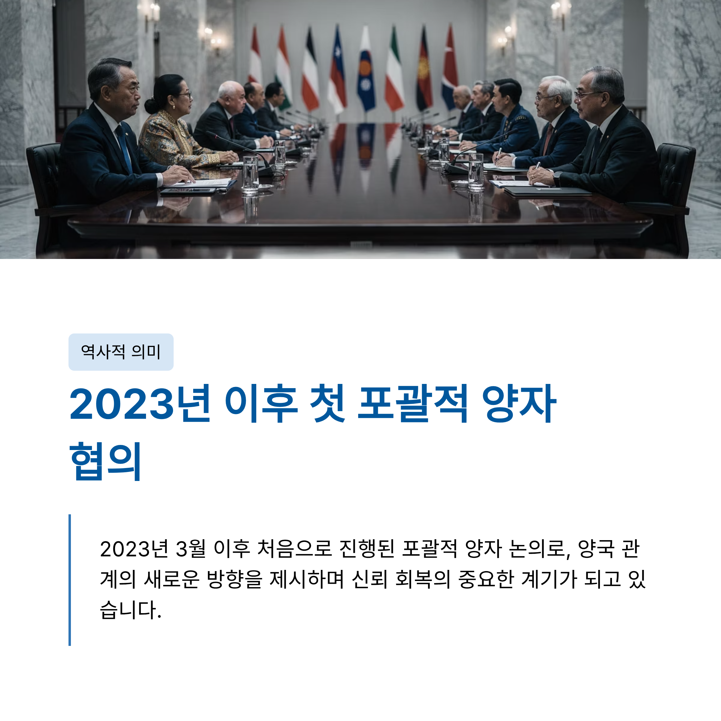 이번 회담은 2023년 3월 이후 처음으로 진행된 포괄적 논의라는 점에서 상징성이 큽니다. 양국 관계의 새로운 방향을 제시하며 신뢰 회복의 계기가 되고 있습니다.