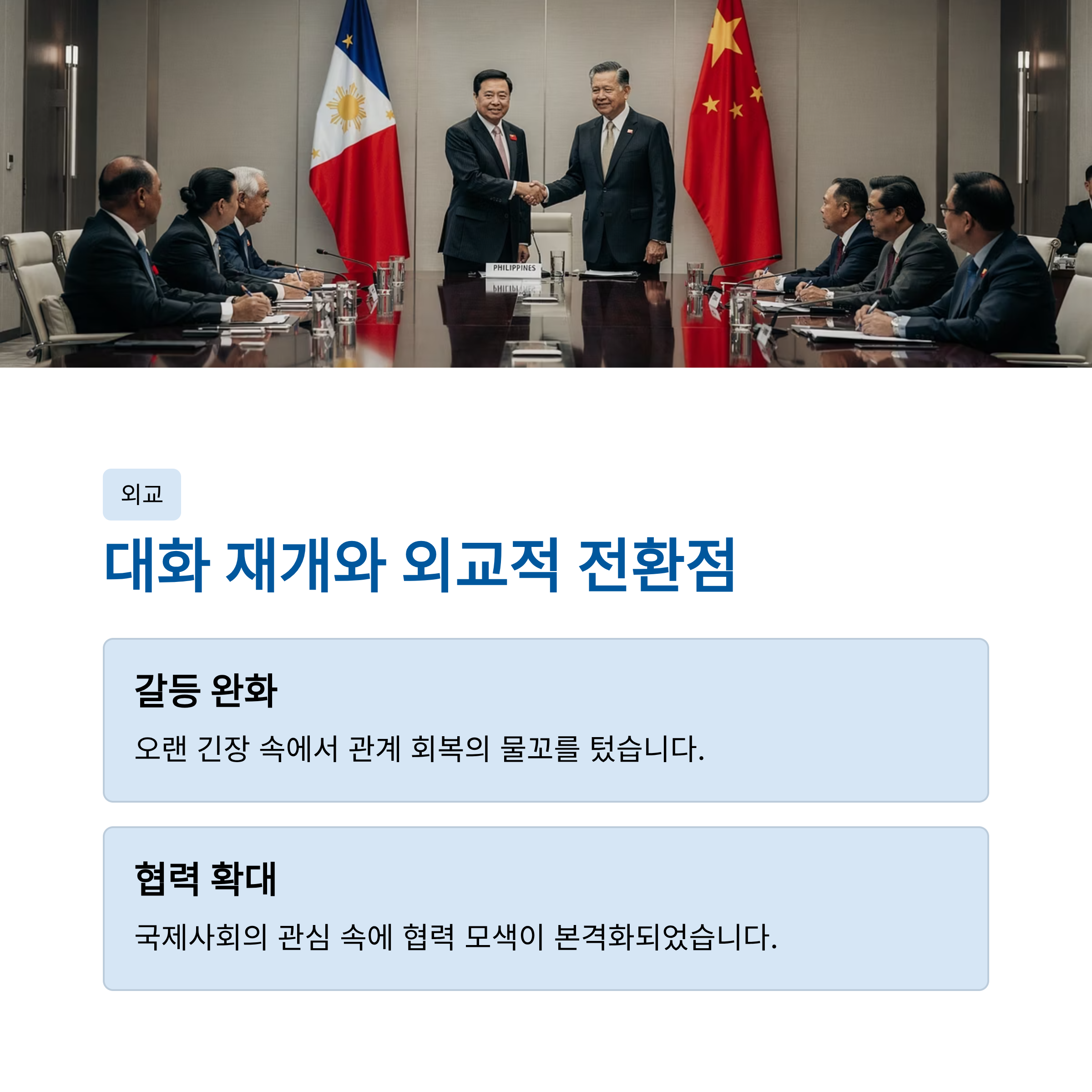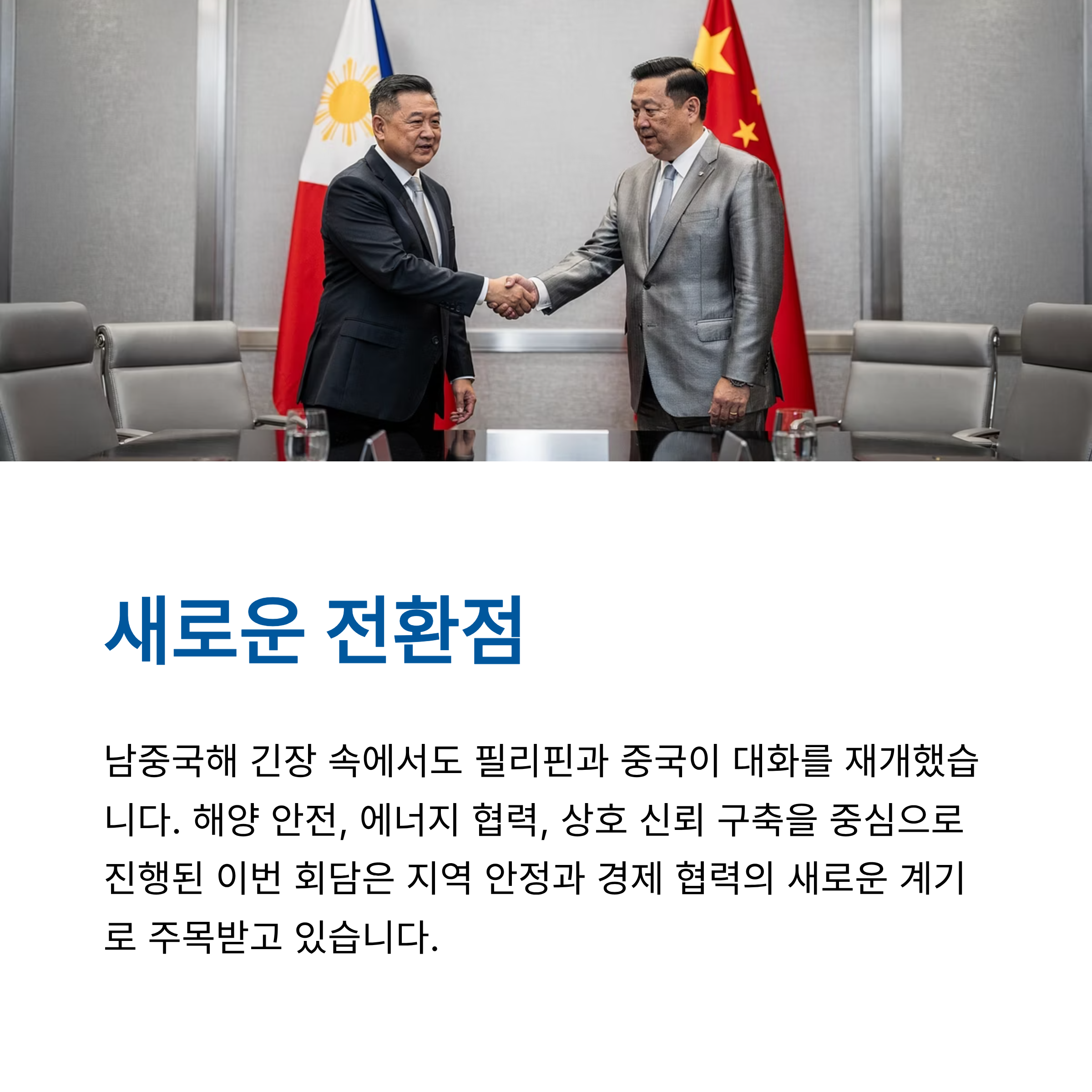남중국해를 둘러싼 긴장 속에서도 필리핀과 중국이 대화를 재개하며 외교적 해법의 가능성이 다시 주목받고 있습니다. 이번 회담은 해양 안전과 에너지 협력, 그리고 상호 신뢰 구축을 중심으로 진행되었으며, 지역 안정과 경제 협력의 새로운 전환점이 될 것으로 기대를 모으고 있습니다.