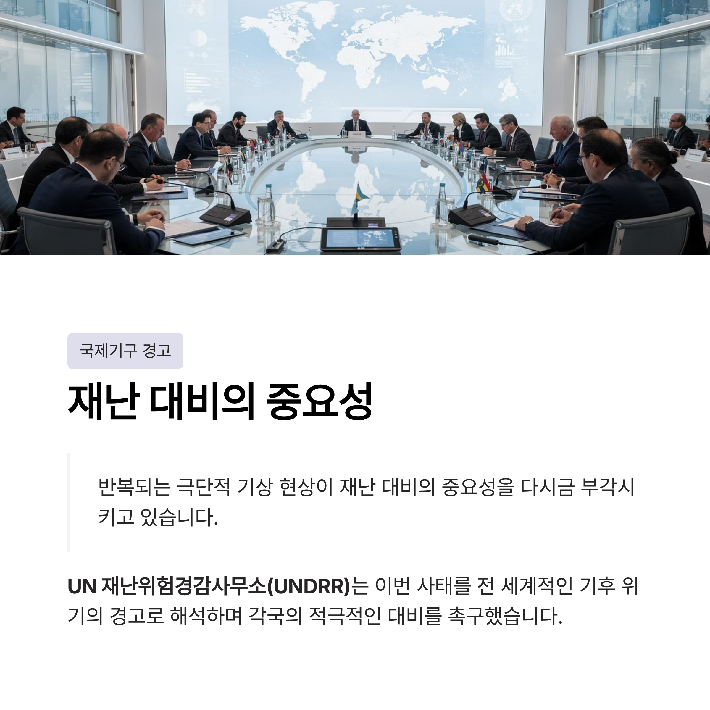 United Nations Office for Disaster Risk Reduction는 반복되는 극단적 기상 현상이 재난 대비의 중요성을 다시금 부각시키고 있다고 강조했습니다. 이는 전 세계적인 기후 위기의 경고로 해석되고 있습니다.